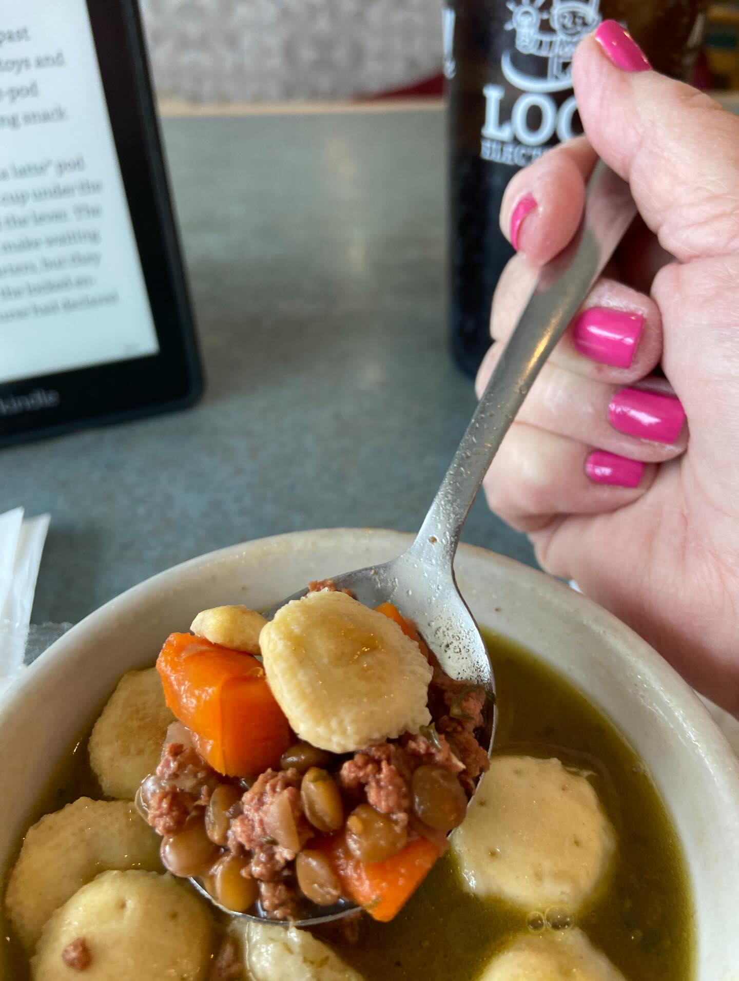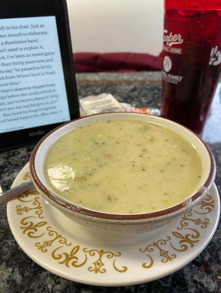I didn’t JUST eat fudge samples…..I did find a really great place to have lunch! I strolled down Main St looking at menus in windows till I saw one that piqued my interest….Horn’s Gaslight Bar! It was a lovely old-time looking bar with a very appetizing menu…..I had the beef sliders (three small delicious hamburgers with grilled onions and bacon) and asked for the soup of the day instead of french fries – it was chicken & dumpling soup and it was incredible – full of veggies and chicken and dumplings in a thick, creamy broth!!! It was an awesome lunch!!! I sat there on their purple chairs enjoying the music and reading my book while I ate — a great time!