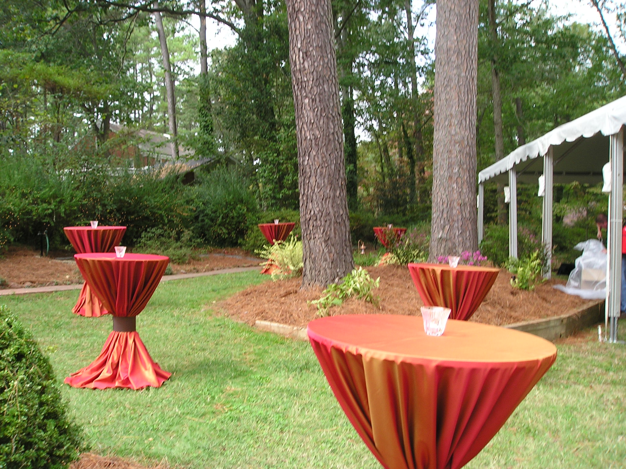 The home and grounds itself is always the primary source of beauty, but we also add some festive flairs — twinkle lights on bushes, spot lights shining across ponds and up into trees (provided by JS Howard Electrical), tents, and elegant linens on tables. We also have chandeliers in the tents to provide lighting and give the essence of being in an elegant ballroom. CES Lighting and Design donates the use of the chandeliers! The linens are a different color scheme every year. This year, we chose black and silver. Here are a couple shots of the linens at last year’s event in the back yard of Fred Von Canon’s home – this year’s tables/linens will look the same, except for the color: