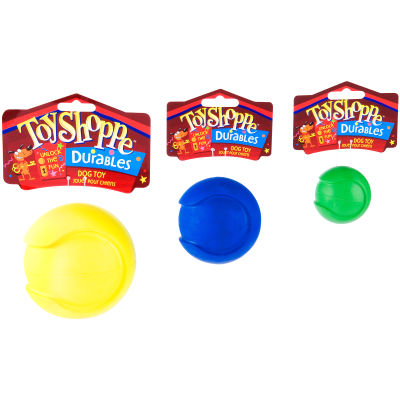 She has several different colors and loves them all, but the most recently added one is always her favorite until a new one is added! She will still play with all the others, but the “newest” is always the one she makes a point to play with everyday, takes to bed with her, looks for as soon as she comes in from being outside, and uses for the “Never Ending Game”! Right now that favorite one is a medium sized yellow one. Note that the card on the photo says “Durables” – you wouldn’t think they would be because they are kinda soft and Megan will eat and tear apart everything she sees, but they are!!! She has some she has had for a year or more and they are still intact and still squeak!