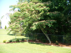 This morning, I snapped these two pictures of my beautiful, crooked mimosa tree! I love this tree and look forward to it blooming every year about this time! When I first moved into my house, most of the back yard was crammed full of wild weeds and stumps and broken trees and vines. It was unusable, so I rented a back hoe and Ronald, Robby, and I worked to clear it out so I could do some nice landscaping and use the entire yard……OK, so it was actually mostly Ronald and Robby, but I also put some time in on the back hoe tearing out tree stumps and debris! One tree they wanted to pull out was this mimosa tree — because it had grown crooked and looked weird! But, I wouldn’t let them — I thought it was quirky, not weird, and if it fought that hard to make its way up through all the crappy stuff to survive, then it deserved to continue surviving! And I think it makes a perfect statement in my landscaping! Yeah, I know – these grow wild all over town and are messy when they shed their blossoms, but I still love it and it isn’t located where the messy blossoms are a problem! But, I do cut down the new ones that try to come up from the seed pods it drops – I don’t want a forest of them! hahaha Look at how pretty it looks in the corner of my lot and check out that gorgeous Saturday morning blue sky!