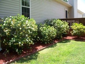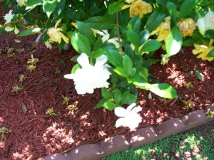 I almost missed the Gardenia blossoms across the back of my house!!! The buds were just barely ready to pop when I left and by the time I returned, some of the blossoms were already spent! But, it is still blossoming and I am so enjoying them – they smell so marvelous and look so beautiful!