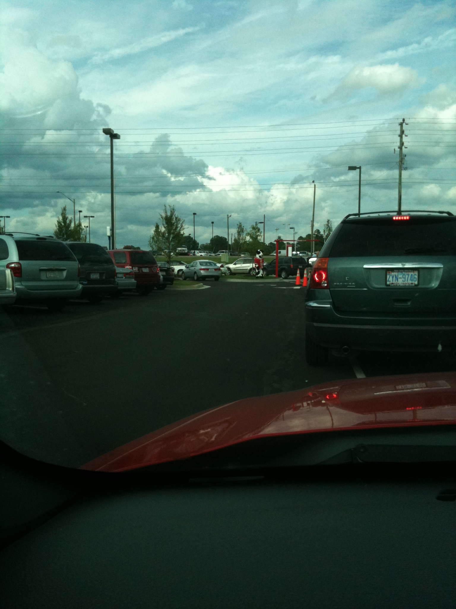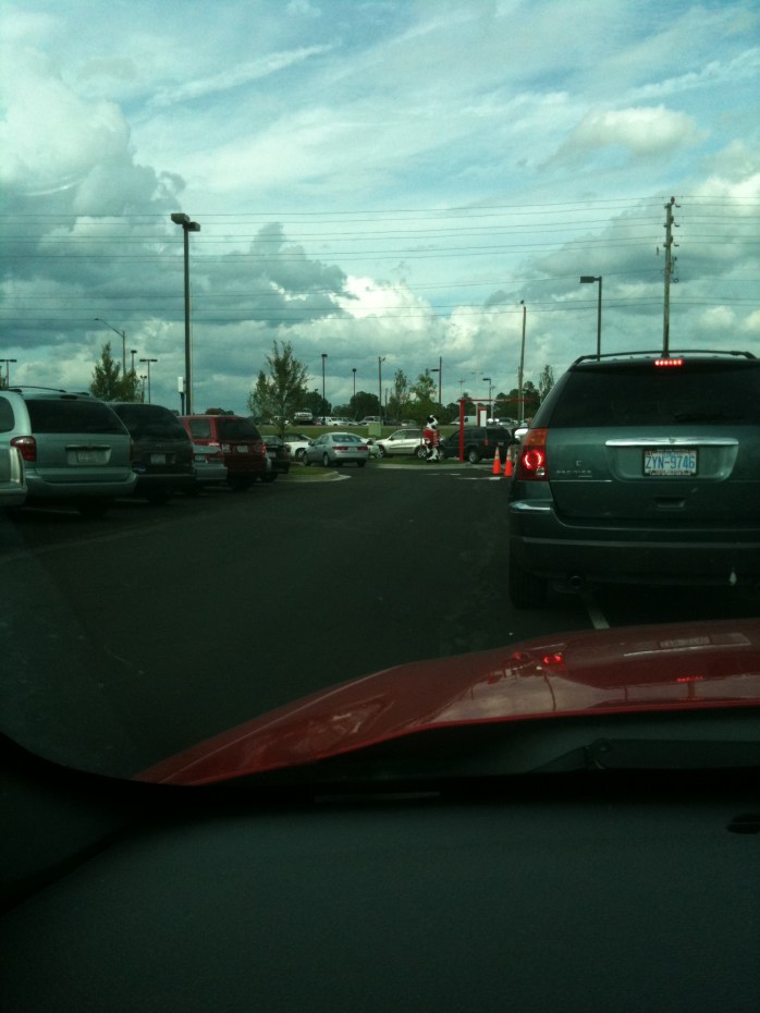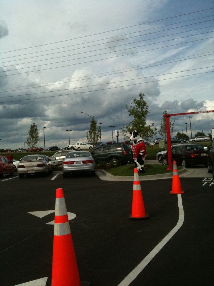 The first I came up on was welcoming every car and handing out a photo sheet of the menu board so that we could decide what we wanted to order before we got to the speaker to place our orders.  He was very cheery and friendly – commenting on how I should have my top down on such a beautiful day!  Then, right at the bend where the line split into two lines for two order boards was the famous Chick-fil-A mascot – a cow wearing a jersey with words begging people to “Eat Mor Chikin” – waving at everyone.  Thankfully, his costume hid his face, cause I’m sure it was beet red and not very happy to be wearing a fur outfit in the almost, if not right at, 100 degree day we were having!  (don’t let the sky in the photos I took fool you – it was HOT and it was SUNNY and the breeze that was blowing in the threat of a possible rain storm was NOT at all cooling)