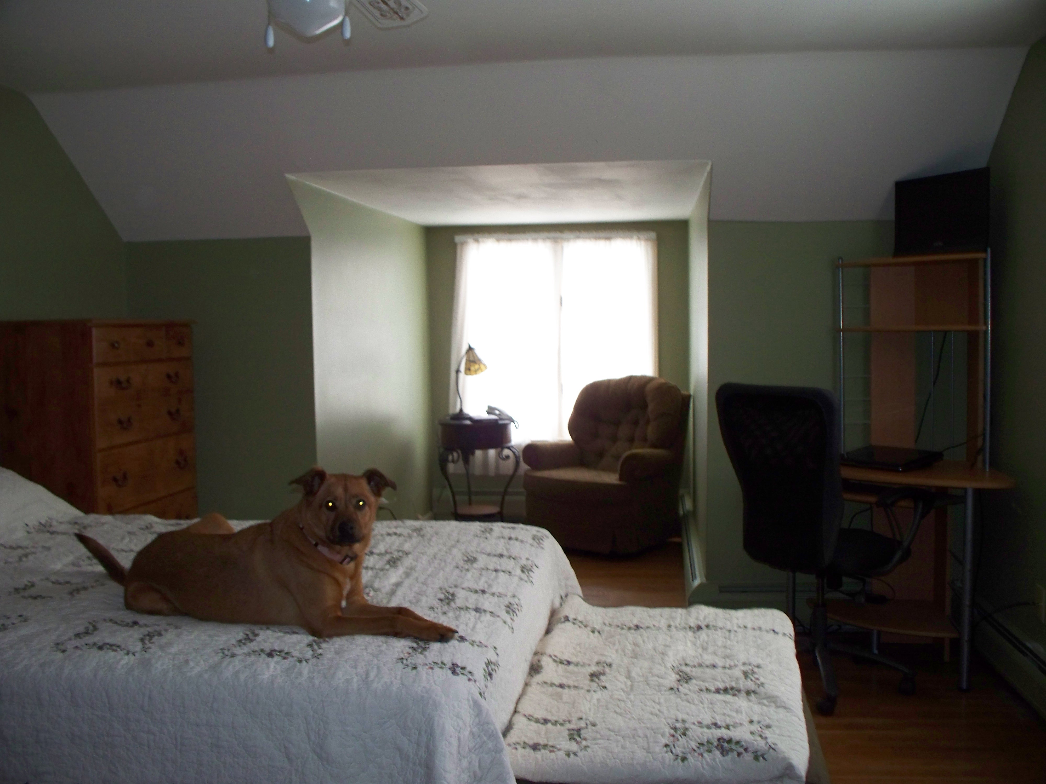 NOW – Megan is up and down those stairs all the time! She runs around the downstairs, then up the stairs, runs all around the upstairs, then back down………I hear her race up the stairs and I hear her tearing all around the rooms upstairs and up on the bed and rolling all over the bed and off the bed and race back down! She loves the stairs and really loves being upstairs because that is where the bed is! hahaha All three get all excited when I head up the stairs – they have to race to follow me up and watch me do laundry or curl up on the bed while I get my shower or when I’m sitting in the dormer. When I say “time to go upstairs for bed”, they leap up and run to beat me to the top of the stairs, where they all stand with their wiggly butts watching me follow them up. When I get close enough for Megan to reach me, she stretches out to give me a kiss – like she’s congratulating me on making it to the top – then she quickly turns and runs to jump up on the bed! hahaha