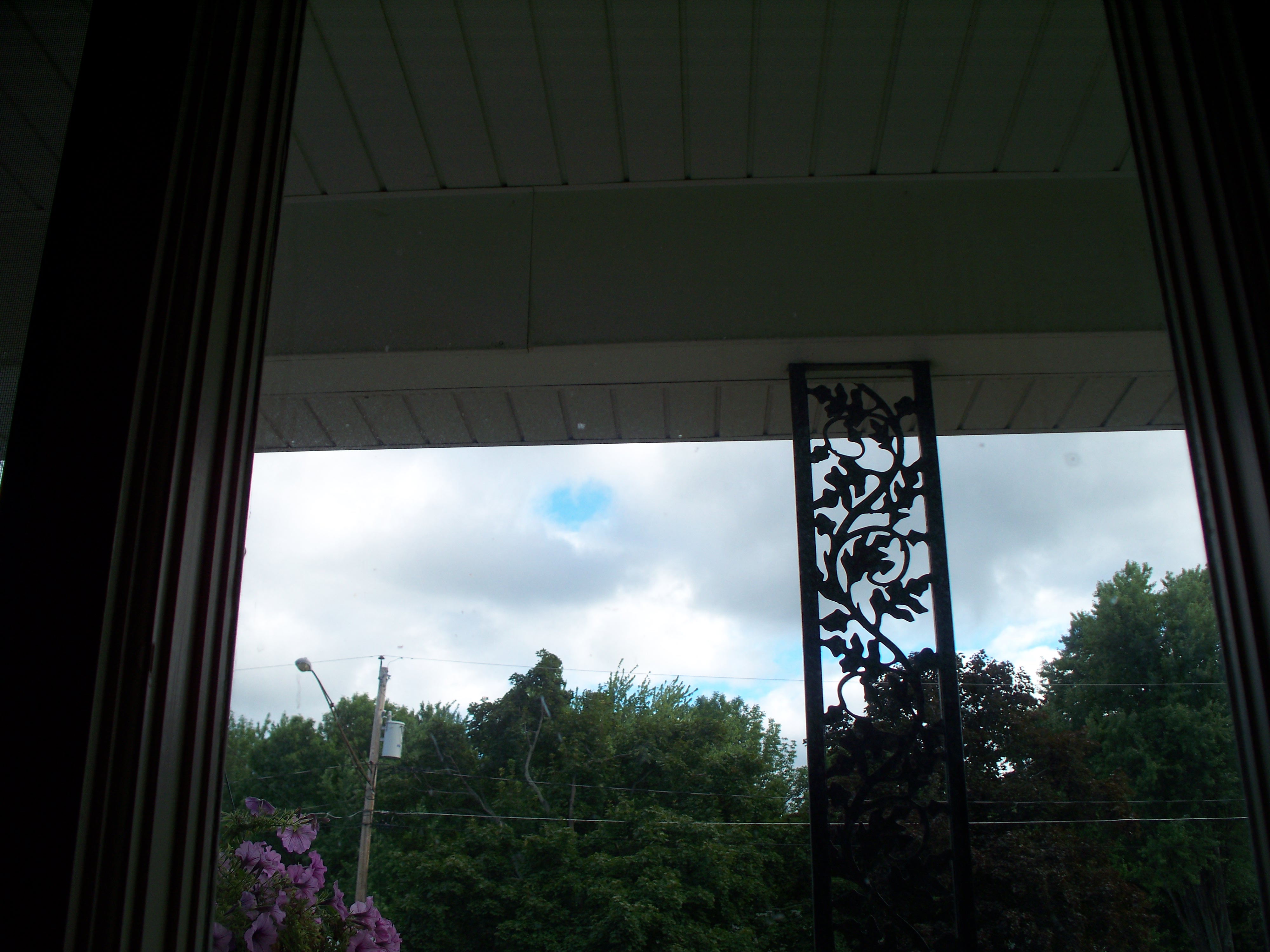 Here is how it all happened: I was sitting at my desk in the den, like I do every morning, reading the local newspapers and catching up on Facebook and my Words With Friends boards. My desk faces the front window that looks out over my front porch. I was reading and glancing out at the neighborhood, like always. I noticed the sky across the street was full of grayish clouds and wondered if it would rain again today or not and then went back to the article I was reading. A few seconds later, I looked out at the sky, again, and there it was………a break in the clouds that was a perfectly shaped sky blue heart! It stood out like a sore thumb against the darker clouds and I was mesmerized by it! Luckily, I keep my camera in the center drawer in my desk and I thought quick enough to grab it and snap the photo. It only lasted a few seconds – by the time I snapped the picture, it was already starting to lose some of its shape. I thought of going outside onto the porch for a better shot, but I could tell by the rate it was breaking apart that I got the best shot I was going to get. And then, it was gone…….no trace of it ever existing! Like it formed just long enough for me to see it…….like it was just for me at that short moment and then it was gone! But……I captured it forever in this amazing photo – not quite at its most perfect form, but before it disappeared: