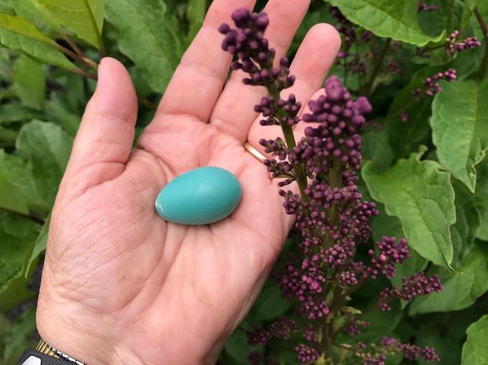 Even though I thought it was a little too big, I thought it was a robin egg. But, when another friend questioned its size, I googled “birds that lay blue eggs” and now think maybe it might be a starling egg, instead…..looks the same as a robin egg, but just a bit larger!