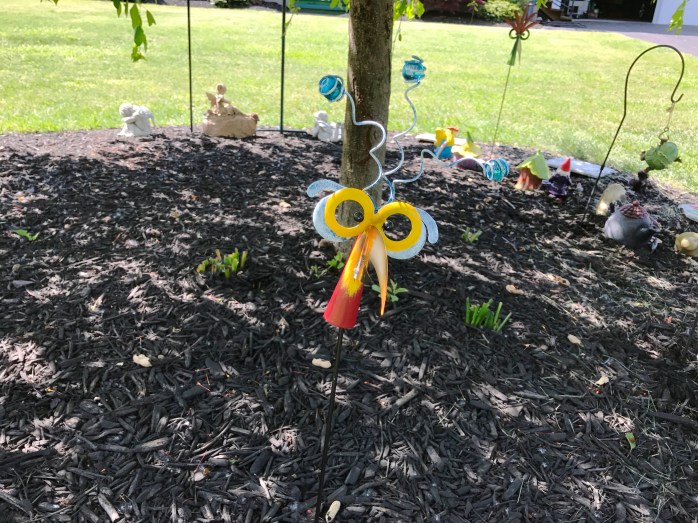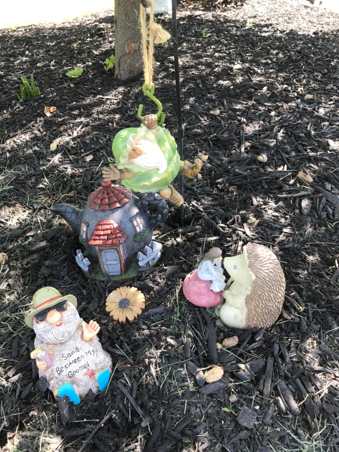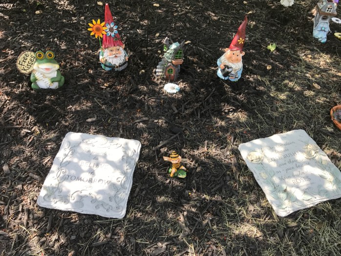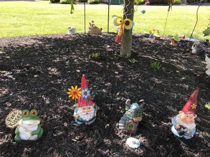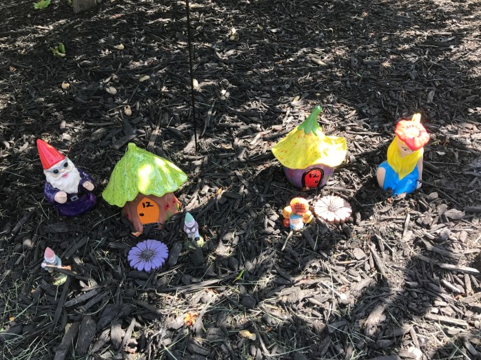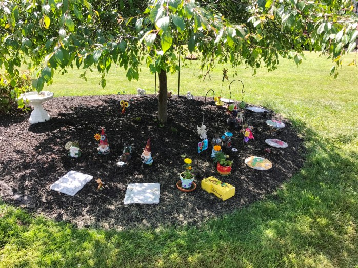 So……my Fairy Village…….it is a horseshoe shape around the base of my weeping crab apple tree with special stepping stones as the border! There are fairies, gnomes, fairy houses, flowers, the Bird Buffet, and some really cool things I picked up at the Oz-Stravaganza Festival I attended in Chittenango, NY this past weekend!!! Some things were bought and some I made myself! I think it is a really nice little Village that I hope the fairies and gnomes enjoy! 🙂