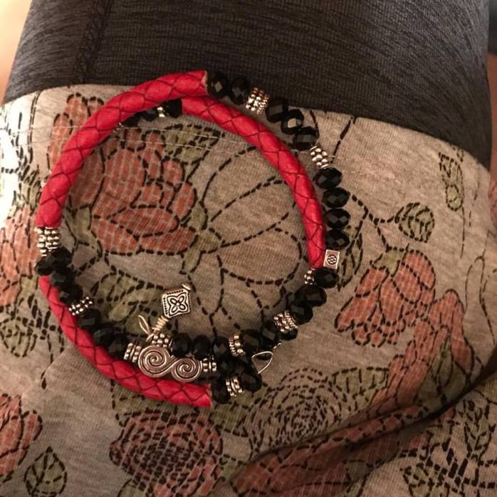 Today’s LuLa Roe is one of my favorite LuLa Roe Perfect Ts with a pair of charcoal capris and a red and black memory wire bracelet I made from a kit from Bead Breakout!
