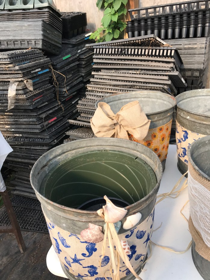 My finished creation on my back deck…..LOVE the decorated vintage maple buckets we put our plants in!!!