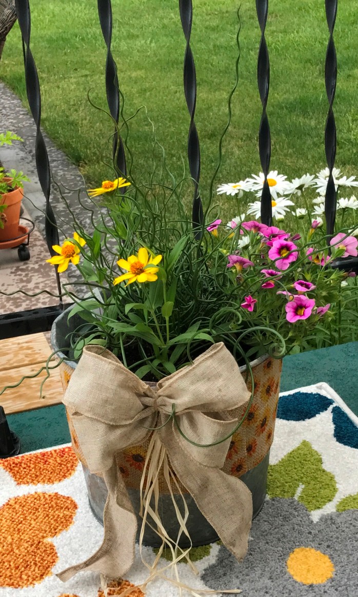 I made mine with some yellow zinnias, pink bells, and a curly grass perennial that I can add new color to year after year!