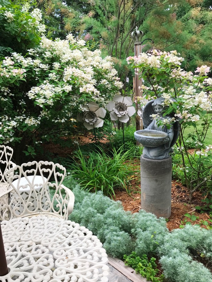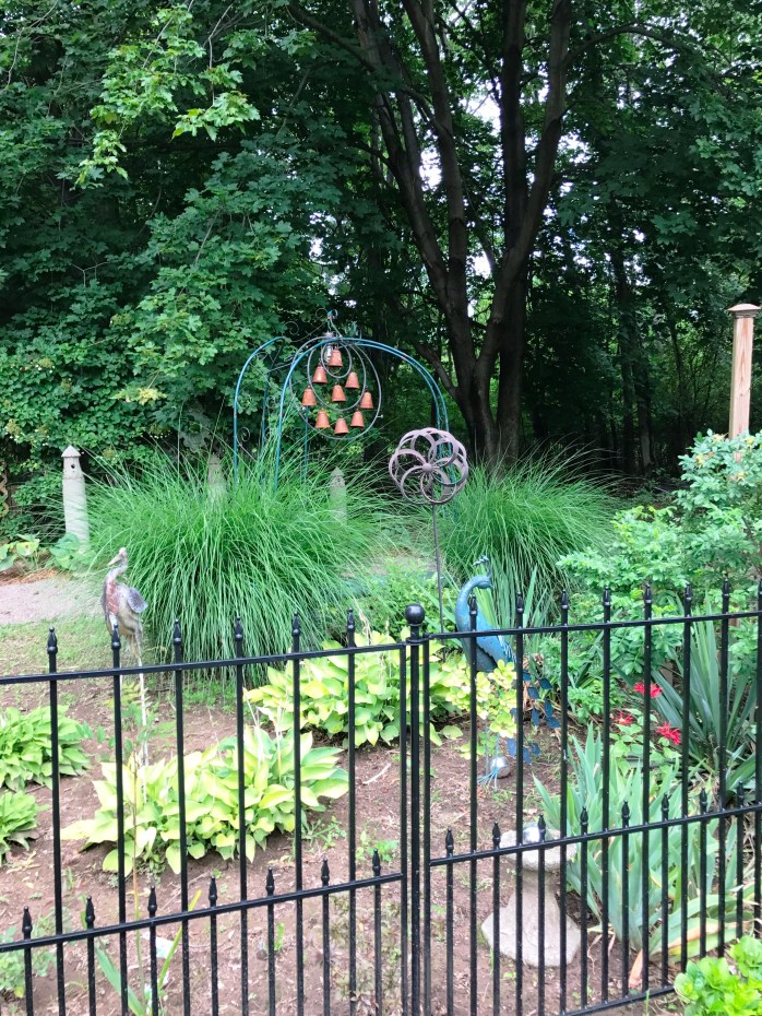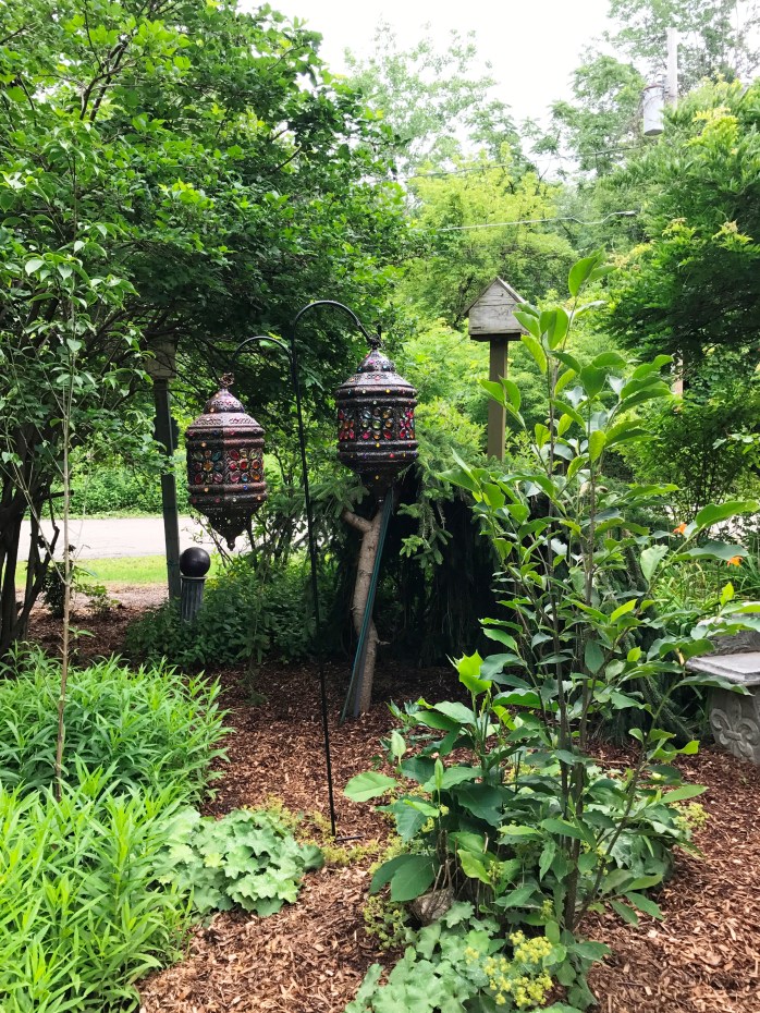 The Riley residence is tucked away on a dead end street on the edge of the Village bordering the canal. You’d never know it was there if you didn’t have a reason to wander back there. But…..once you do come upon it, you find a hidden treasure to be cherished and appreciated and taken in leisurely and with your eyes wide open. I’m sure we missed something wonderful as we meandered our way through a maze of paths, gates, archways, sculptures, lanterns, bird houses, flowers, trees, and several uniquely themed seating areas. They have found some of the most amazing and unusual items to incorporate into their gardens to make them interesting and different than anything I’ve seen in gardens anywhere! What a treat!