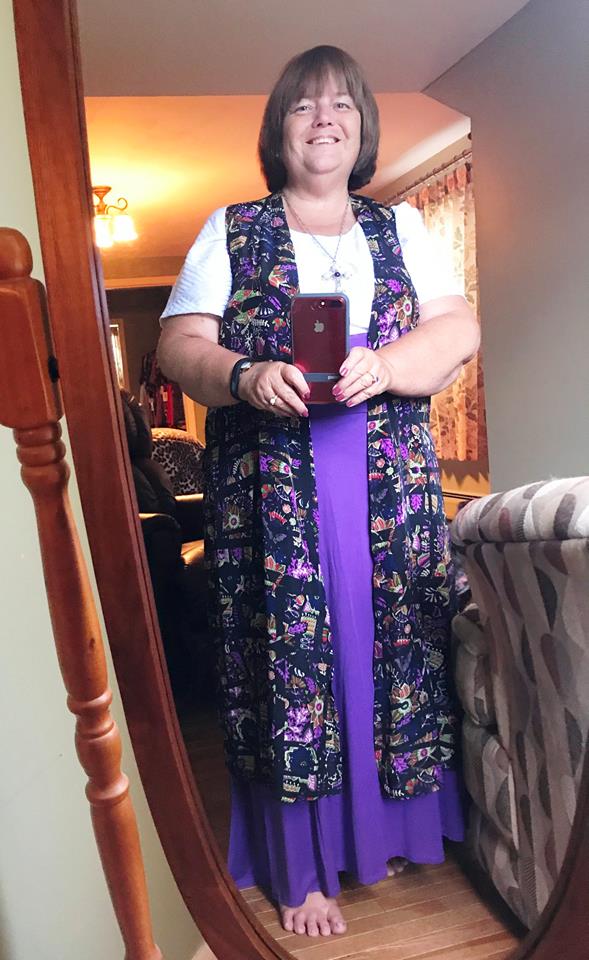 I attended an AHS Alumni Foundation Reception this evening, so I (of course) wore my purple Maxi skirt, white shirt, and this great Joy duster! Gotta show my school spirit!!! (But…..I wish I had chosen to wear my purple Carly with the Joy…..would have been cooler!)