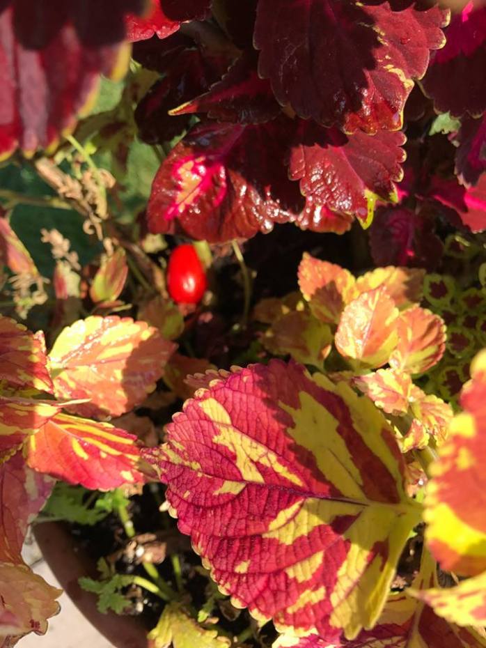 I was watering my plants and noticed something red inside my coleus…..upon closer inspection, I learned it was a grape tomato – not attached – not growing there – just sitting there! Wondered if a bird dropped it there or what…..found out it most likely fell in there while it was on display at the Flower Show at the Orleans County Fair, where an entry involving grape tomatoes was displayed above it! hehehe