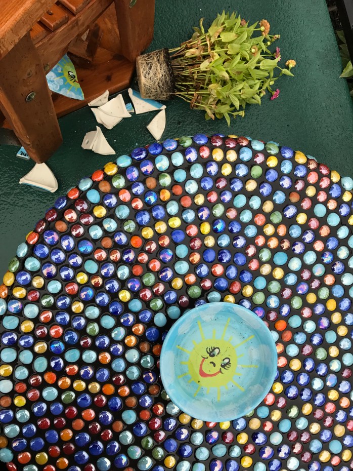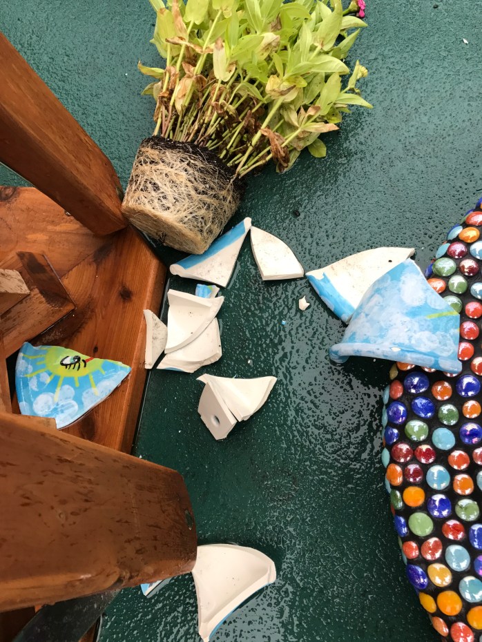 The pretty sunshine planter I made got blown off the table in this afternoon’s storm…..at least the drainage tray was spared!!! π¦