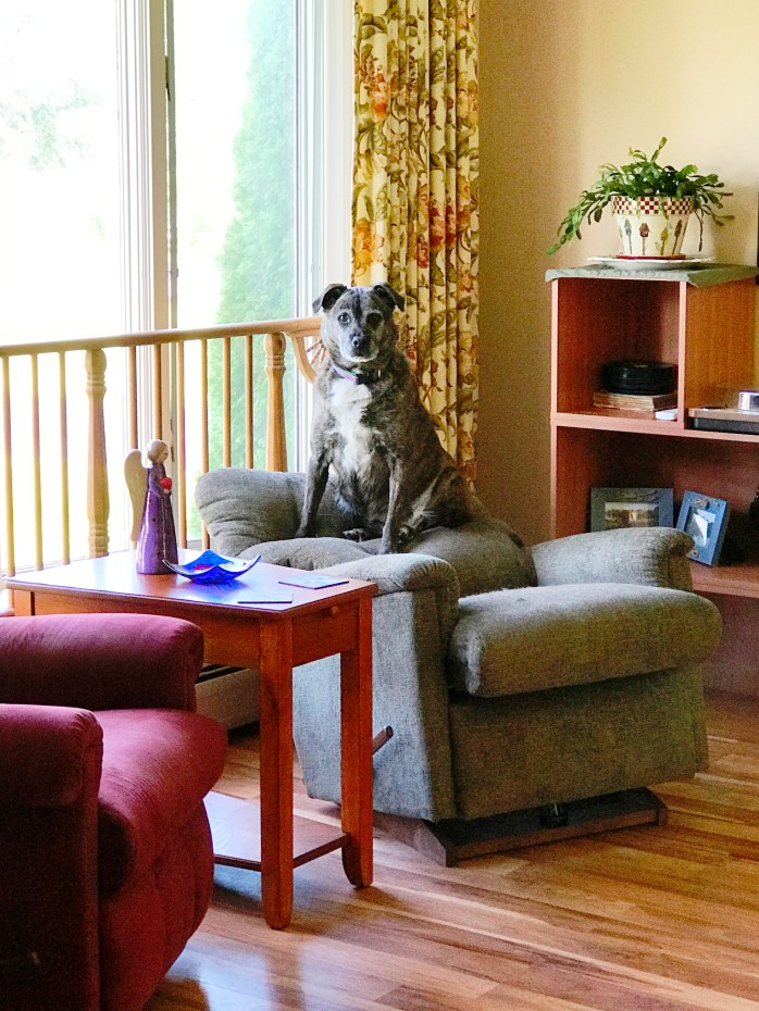 Megan hasn’t been too happy since I got rid of my leather couch and replaced it with these two rocker-recliners…..she loved to lay up on the top of the back and look out the window! But, she has discovered that she can push the back of the chair back and it is even better – she doesn’t have to teeter on the top of the back of the couch! 🙂