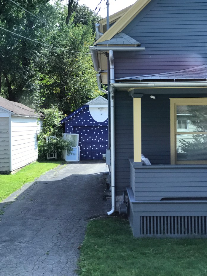 The owners maintain the blue and white polka dot garage to honor her and her most iconic dress!