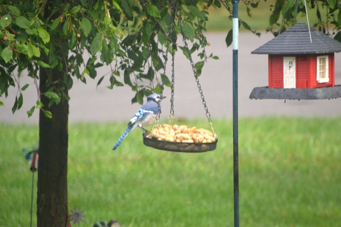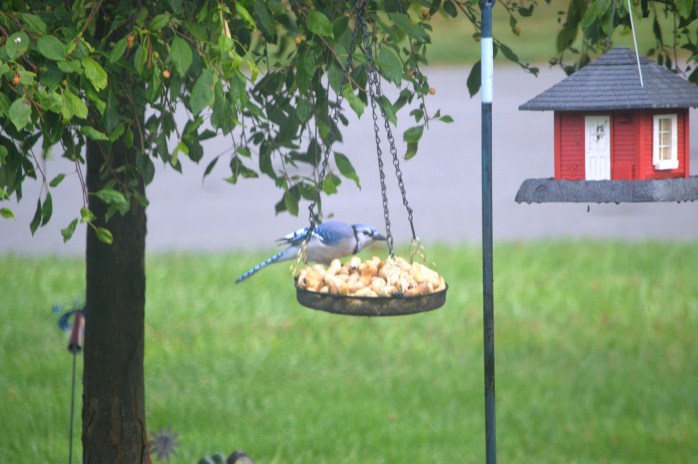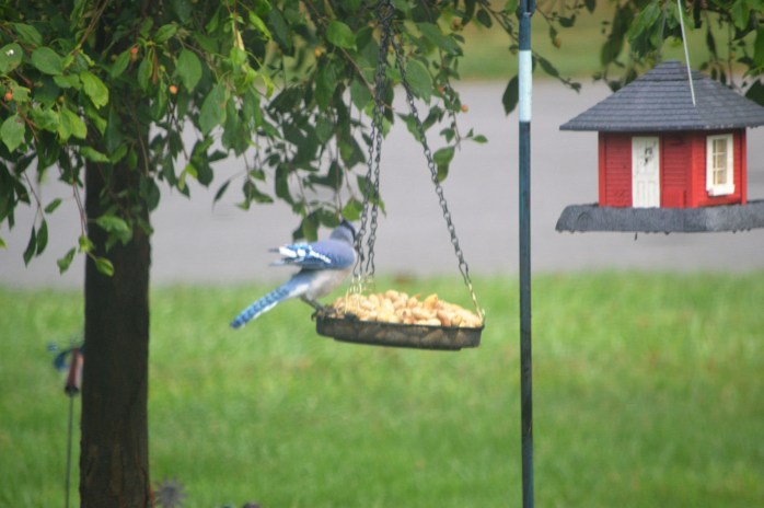 The Bird Buffet was a busy eatery this morning! At one point, I had TWO squirrels, FOUR blue jays, and TWO crows all jockeying for their share of the goodies! The squirrels kept chasing the crows away, but they’d come right back……..the blue jays fought each other for their spot at the tray…….and the blue jays tried to run the squirrels off, but that didn’t work – the squirrels held their ground! Some ate from the tray and others were lazy and just waited to grab up the ones that fell on the ground! It was an extremely entertaining morning, in deed! 😀