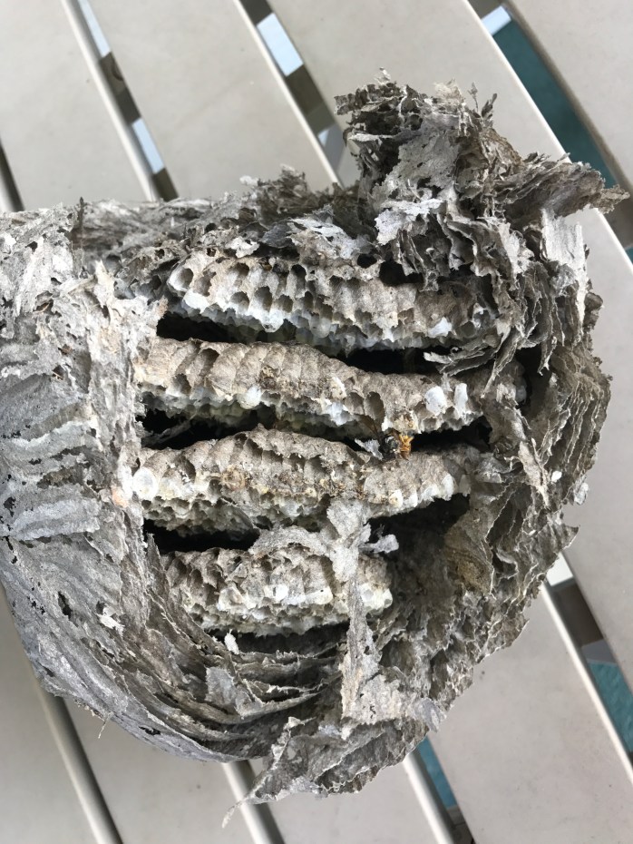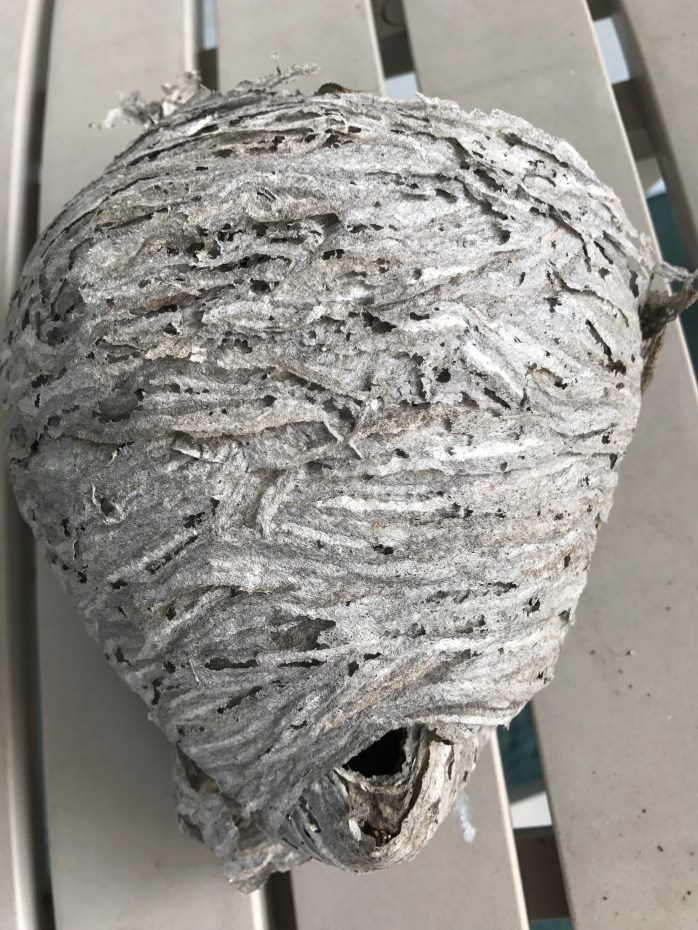 Spider Man Pest Control came to remove my hornet’s nest! Thankfully, he discovered it was inactive and harmless! He scraped it off the side of the house where it was located in my dormer and was successful in getting it down in one piece! A science teacher I know wanted it, if we could get it down intact and it was safe to handle. I have never seen one up close and certainly never seen the inside of one! I was amazed when I saw it……so delicate – it can easily be crushed or crumble – I’m surprised the wind and rain doesn’t ruin it after all the work the hornets put into making it! Also, since it was stuck to the side of the house, it is only three sided, so it is really cool to see all the intricate architecture of the hive…..layer after layer of little homes for their eggs! Incredible! I hope the students who get to study this are as in awe of it as I am! Now…..if it wasn’t inactive, that bugger would have been saturated with chemicals and crushed into nothingness without a second thought! hehehe
