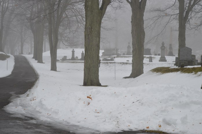 I love taking photos in and of the fog! So, when our Monday brought a heavy fog to the area and I had to go out to have fasting blood work done for my next routine doctor’s appointment next week, well……I took my camera along and took a drive through Mount Albion Cemetery on my way to Brockport!
