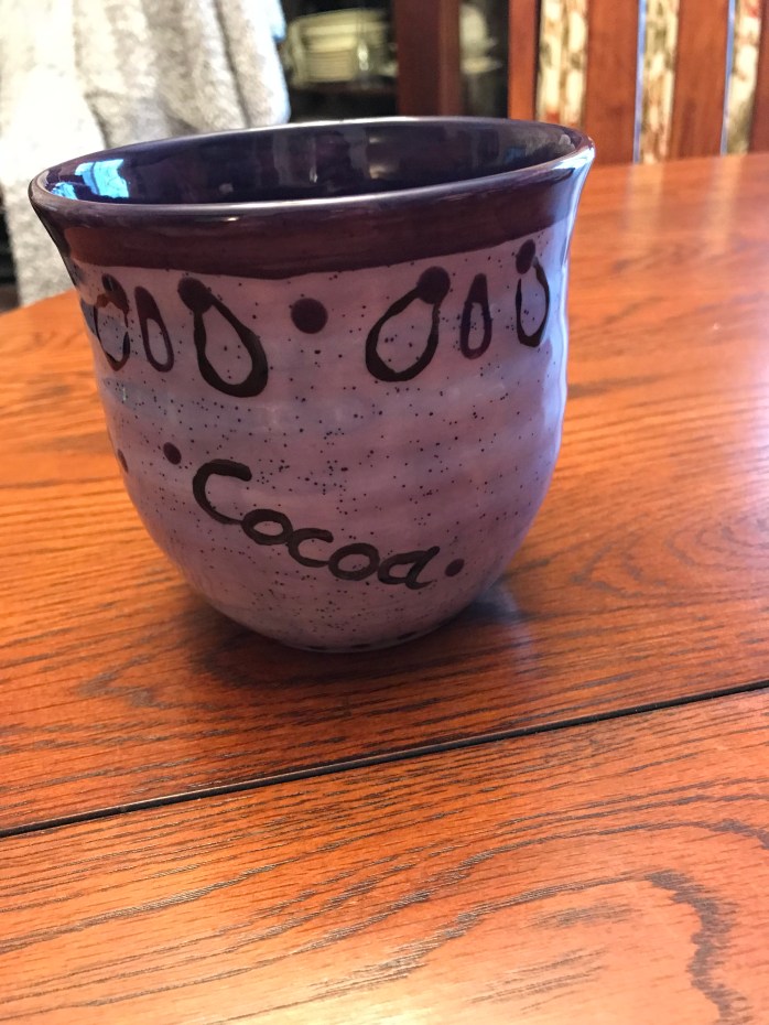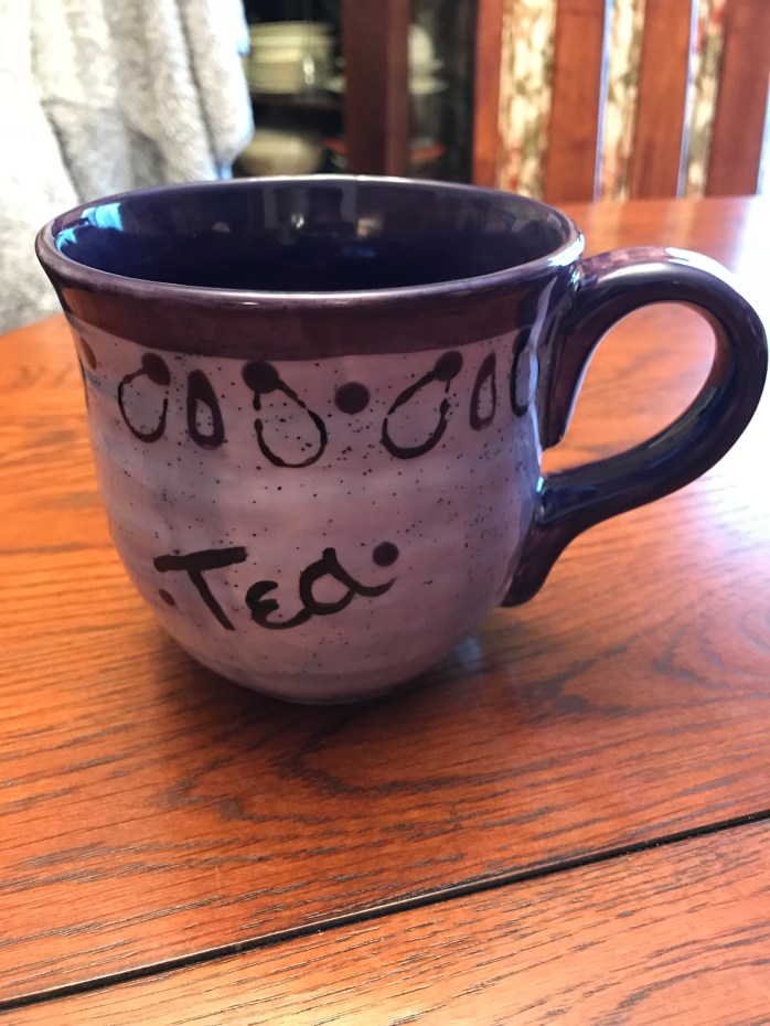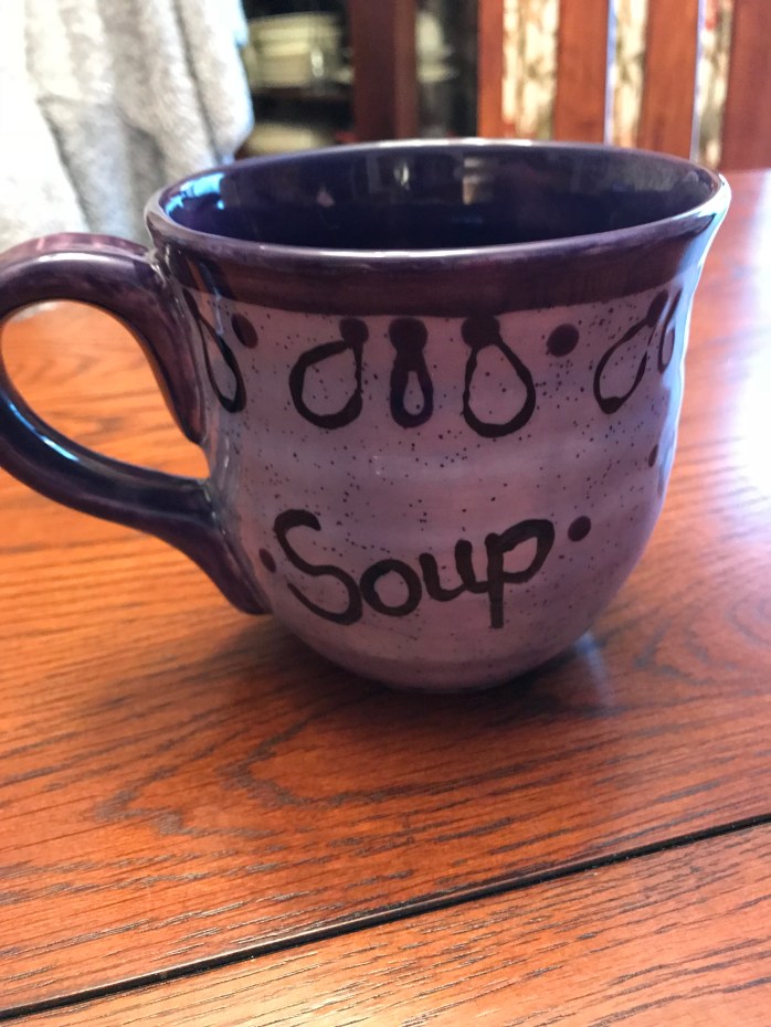 Oh — and, I did a paint and sip night and this is the result: we did a huge mug that I can not wait to use for tea, cocoa, or soup……just one mug, three photos…..and, of course, it is PURPLE!!!! LOL