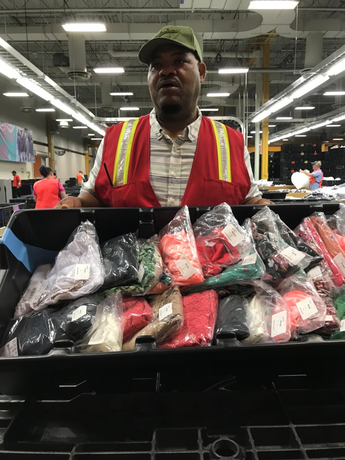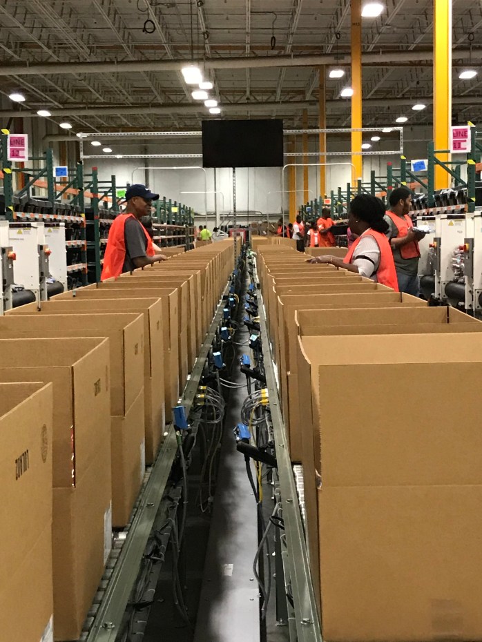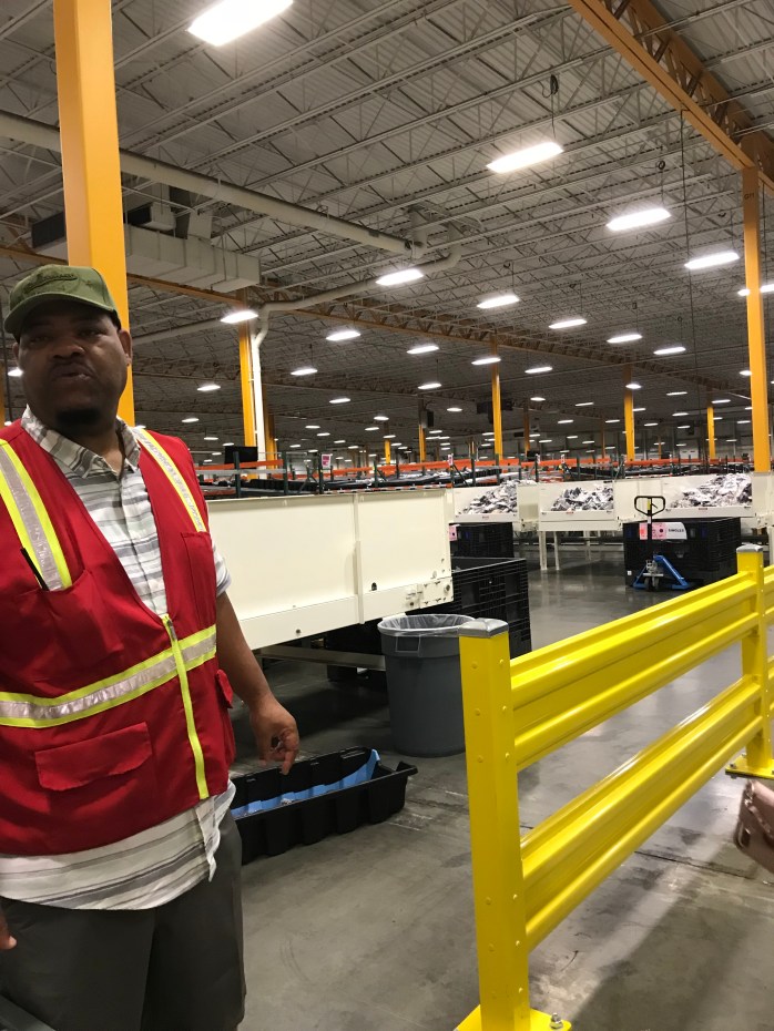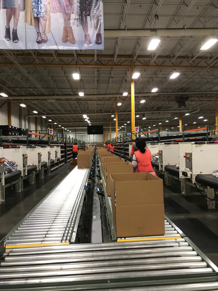 The packing and shipping process is incredible……the boxes all have a bar code that includes everything that should be picked and added to that box…..for instance, say a retailer put in an order for 2 large Carly’s, 4 medium Classics, and 10 one size leggings…..the bar code contains that detail. So, then the box is put on these conveyor belts and starts its journey through the stations. Each station is dedicated to a style and size. The box stops at every station and the bar code reader scans it, if there is no product on the bar code that matches that station, the box moves on……when it gets to the station for large Carly’s, it stops and a light comes on that station and a digital display reads “2” – the worker manning that station will pick 2 large Carly’s and hit the button so the box is released to the next station…..the box then, goes on and until it reaches the station for medium Classics…..and so on!!! Amazing!!! This line is the length of a football field and there are (I believe he said) 12 or so of them!!! Very impressive!!!
