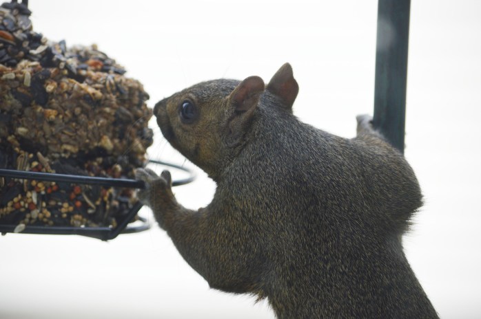 Then, a couple weeks ago, I was sitting at my computer and suddenly the very tall double shepherds hook outside my window – literally two feet from the window – started to jerk back and forth causing the bird feeders to sway!!! I thought, what the heck…….and then I saw it……a squirrel had leaped onto the post and made his way up the shaft to where the seed cakes were hanging to steal himself a treat!!! He went through a series of daring feats to get the morsels and then balance himself on the top to eat and back and forth till he had his fill and left. He absolutely saw me watching him and taking his picture – we made definite eye contact on multiple occasions – but didn’t seem to mind at all! Although he was close enough to get great photos, I still zoomed in to get even better ones!!!
