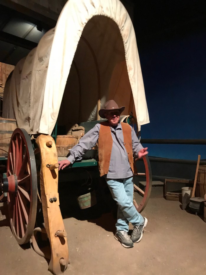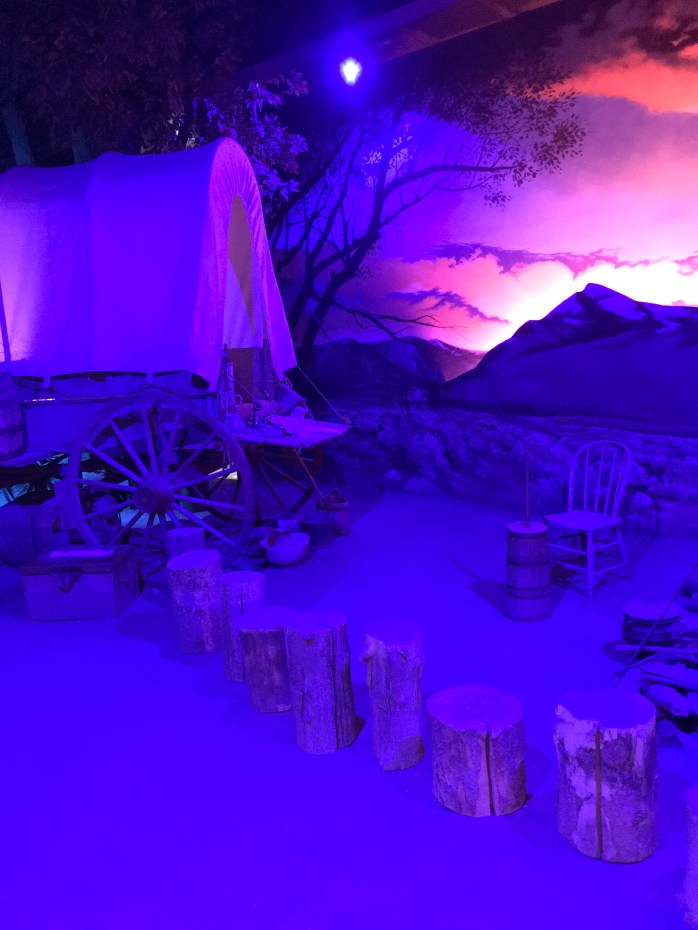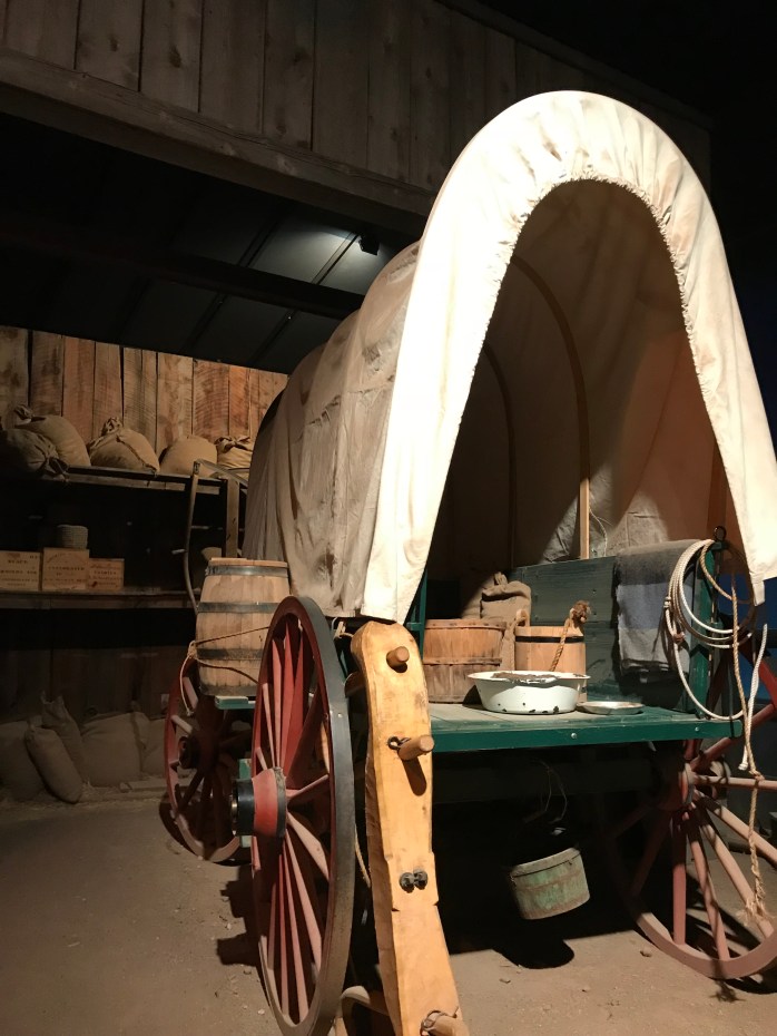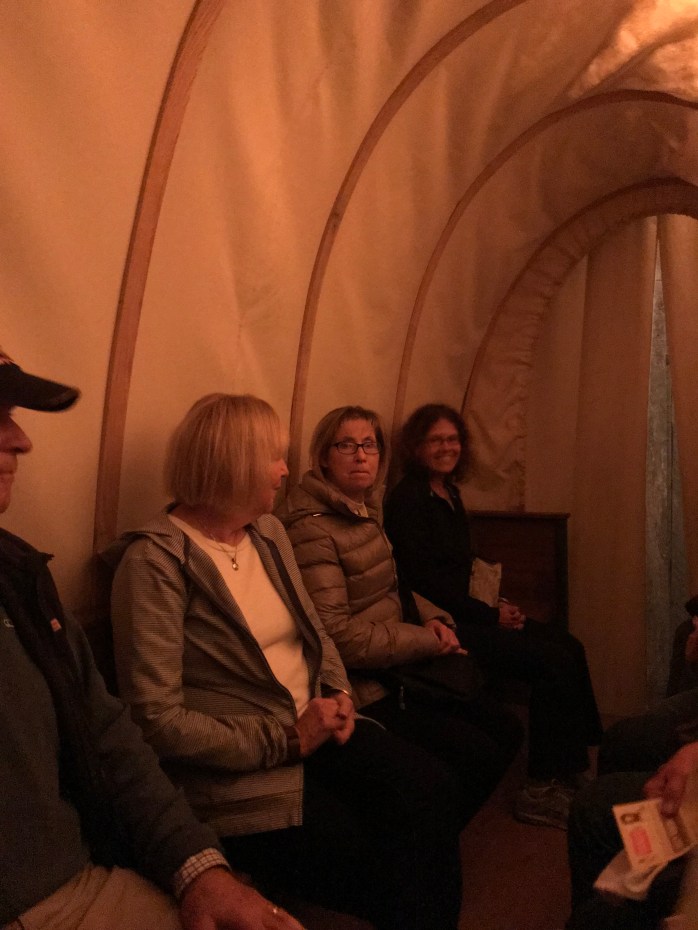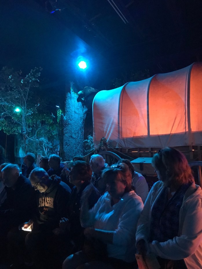 Then, we were taken into a dark room where we got on a wagon and sat along the side benches. Once on the wagon, it began to pitch and bump as we proceeded on a simulated trip along the Oregon Trail. During this time, recorded readings of actual diaries of pioneers who traveled the trail were broadcast for us to listen to – fascinating!