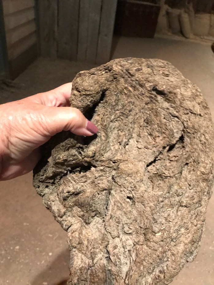 This is a buffalo chip — everyone on the wagon train had a job – it was the kid’s jobs to hunt for and gather buffalo chips that were old enough to be dried just right. They found that buffalo chips were extremely efficient fire materials – they burned hot and long.