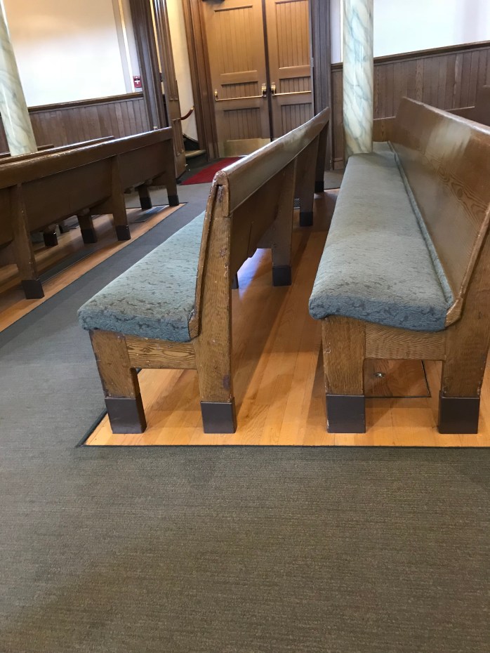 The benches are original to the building – they are situated very close together and had to be elevated on blocks (see the bottom of the legs) because people were typically much shorter and smaller than they are, today!