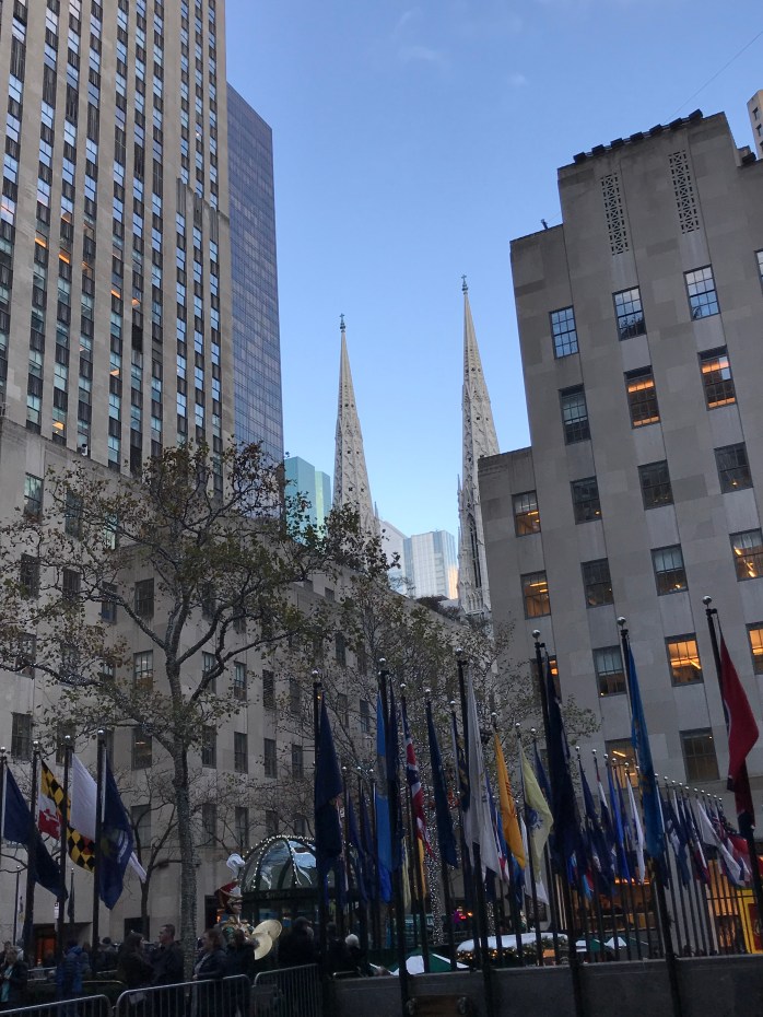 Flags at Rockefeller Center with St. Patrick’s Cathedral spires in the background