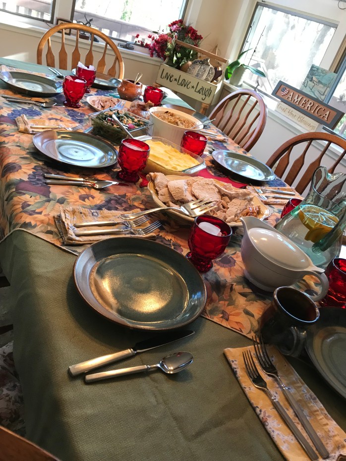 Then, our Thanksgiving was full of family, food, and lots to be thankful for! This was taken BEFORE all the food was on the table…….it shows the stunning pottery plates and mugs made by Linda’s husband, John, who is an artist!
