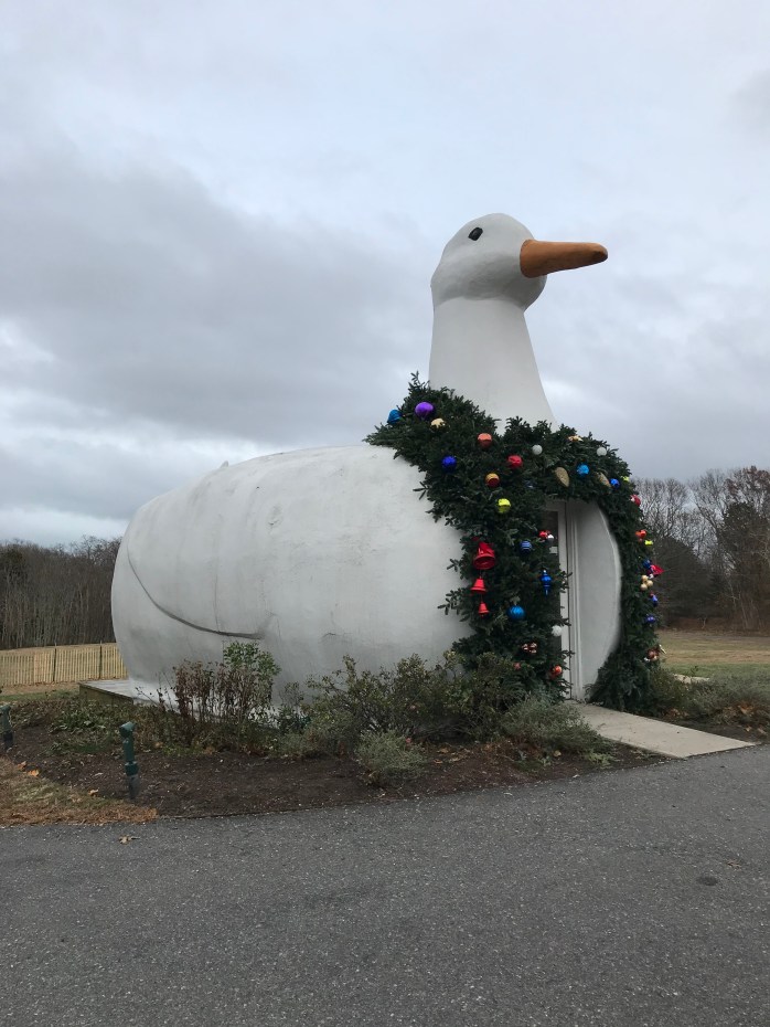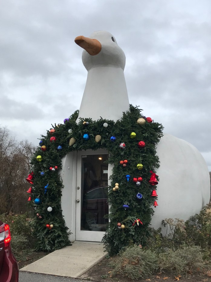 As we drove through Flanders, NY on our way to Montauk, we saw the Big Duck — listed on Roadside America as a quirky American site (click here to read about it)! The duck was originally the location of a shop where a local Long Island farmer sold ducks and eggs – it is now a gift shop! On our way to Montauk, they were just starting to decorate it and when we saw it on the return trip, it was all decked out and ready for photos!