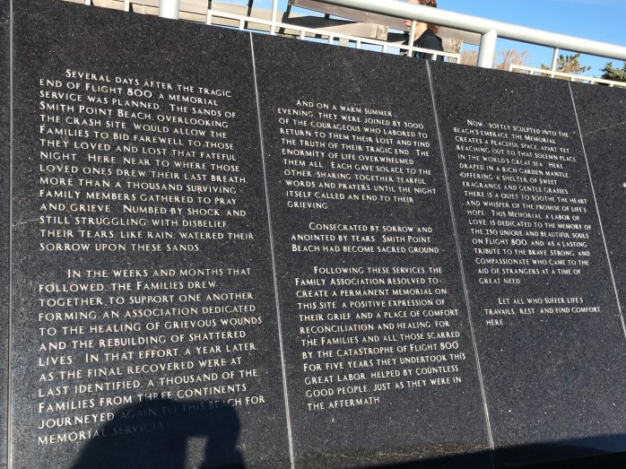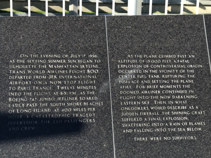 This is the spot on Long Island where TWA Flight 800 took off from JFK on the evening of July 17, 1996 and 12 minutes into the flight crashed just off shore, here! There were no survivors! This International Memorial was established to honor those who died in the crash and those who worked tirelessly in search and recovery efforts.