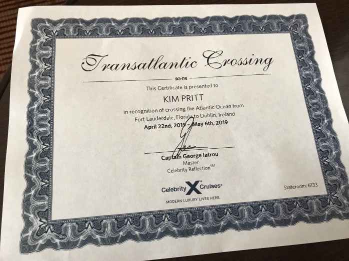 And, finally……the Captain of the Celebrity Reflection issued us all a certificate in recognition of crossing the Atlantic — I thought that was pretty cool!