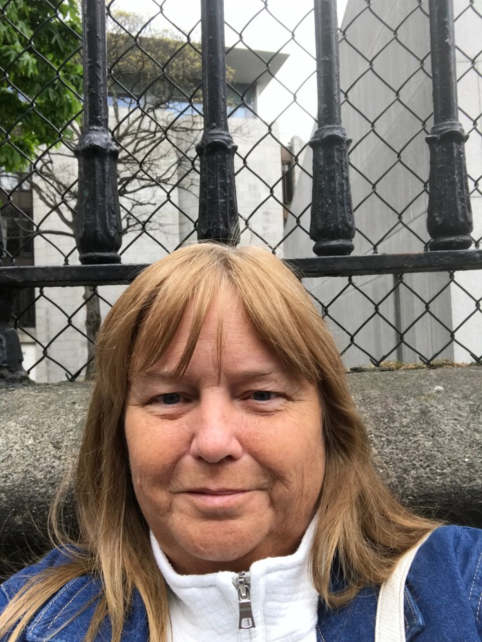 I hopped off at Trinity College because I really wanted to see the Book of Kells —- a book believed to have been created in 800 AD by monks in a Columban Monastery in either Ireland or England containing tables and and text illustrating the four Gospels of the New Testament. It is on display in the Library at Trinity College in Dublin. But……..I discovered they only allow so many people in to view it each day and they already reached their max and were no longer issuing admission tickets! 😦 So – this is me outside Trinity College, disappointed and waiting to get back on the bus! LOL