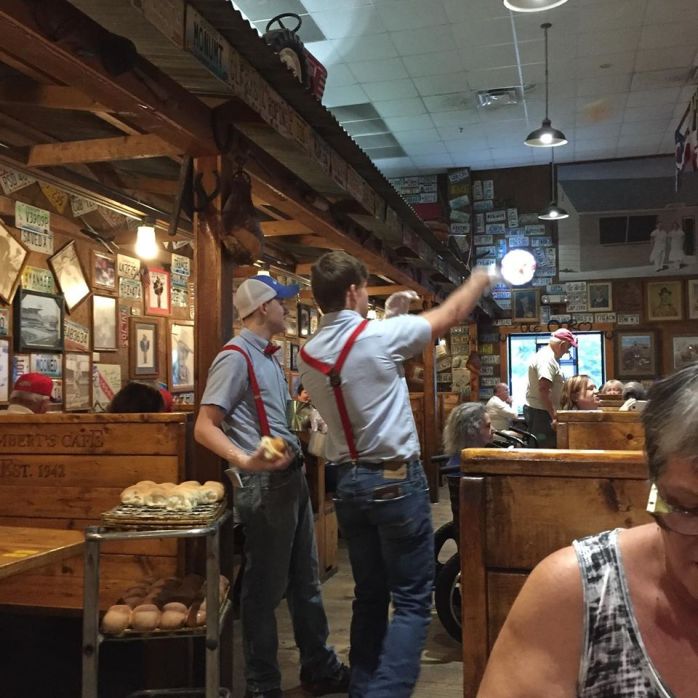 When I  saw that particular day’s photo prompt, I had a few good ideas, but couldn’t stop thinking about the time my brother, sister in law, and I stopped at Lambert’s Cafe in Sikeston, Missouri during our 2016 cross country motor home trip. Lambert’s is “the home of the throwed rolls” – if you want a roll, you raise your hands and one will be thrown to you from across the room!!! LOL