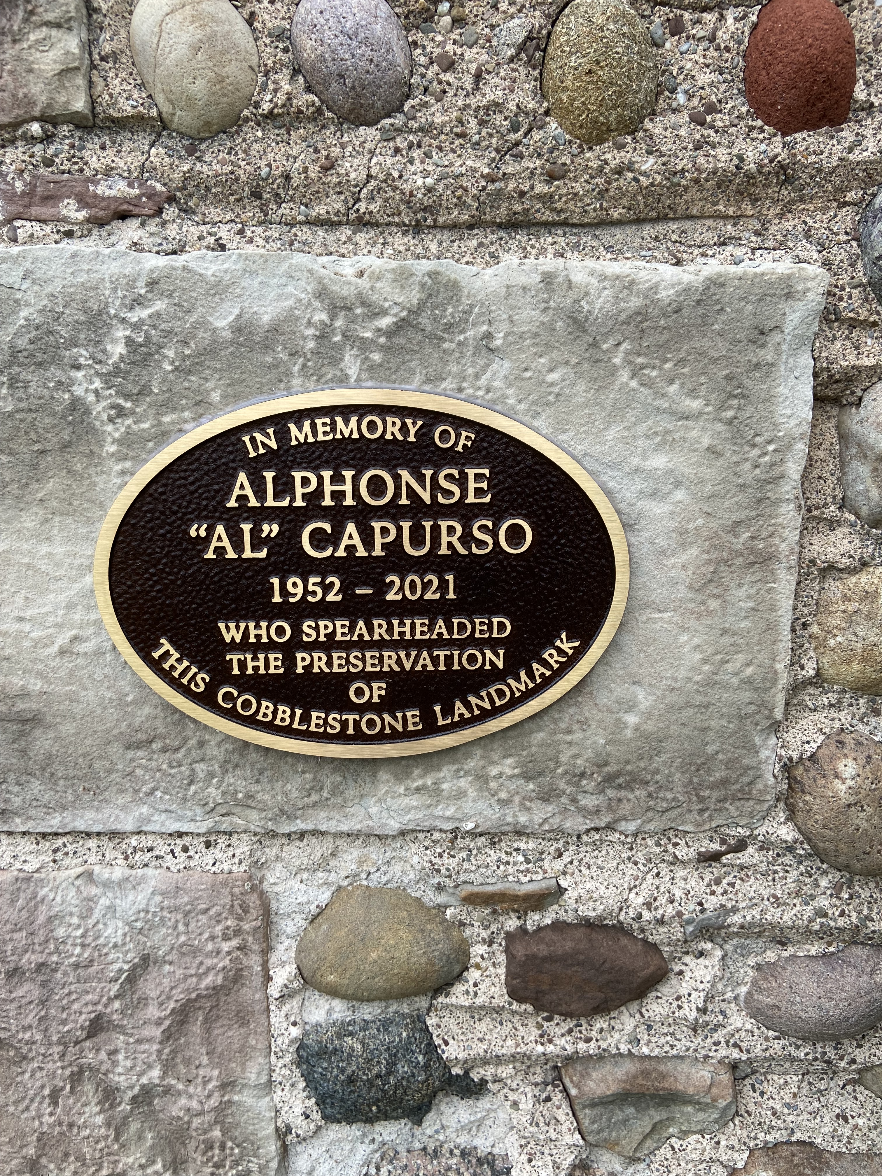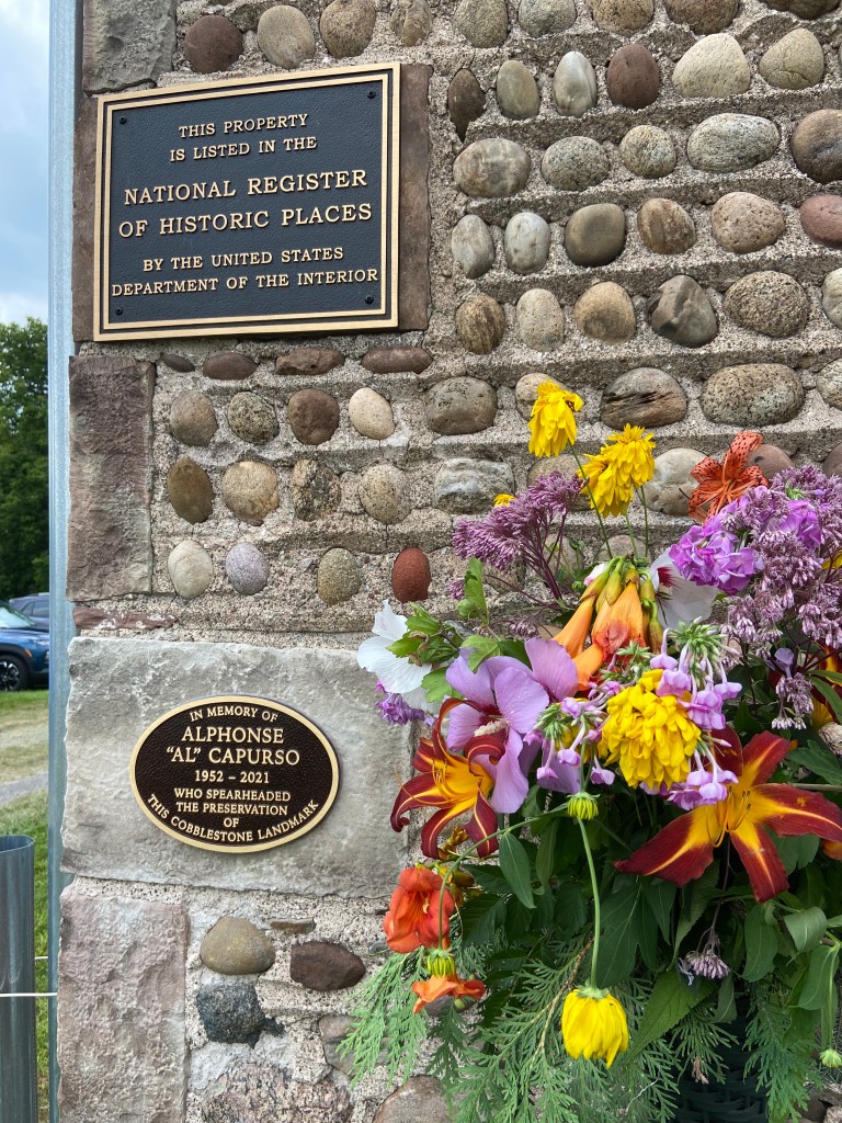 - By 12:30, we had been to five of the six markets. We took a break to attend a Celebration of Life of a friend who passed away in February. He made major efforts to acquire and restore an original cobblestone school house that now belongs to the Historical Society, as well as a log cabin that was moved to the site. He made many other contributions to the community and to preserve our history, but I mention the school because it is where they held his celebration of life with a plaque dedicating the school house to him.