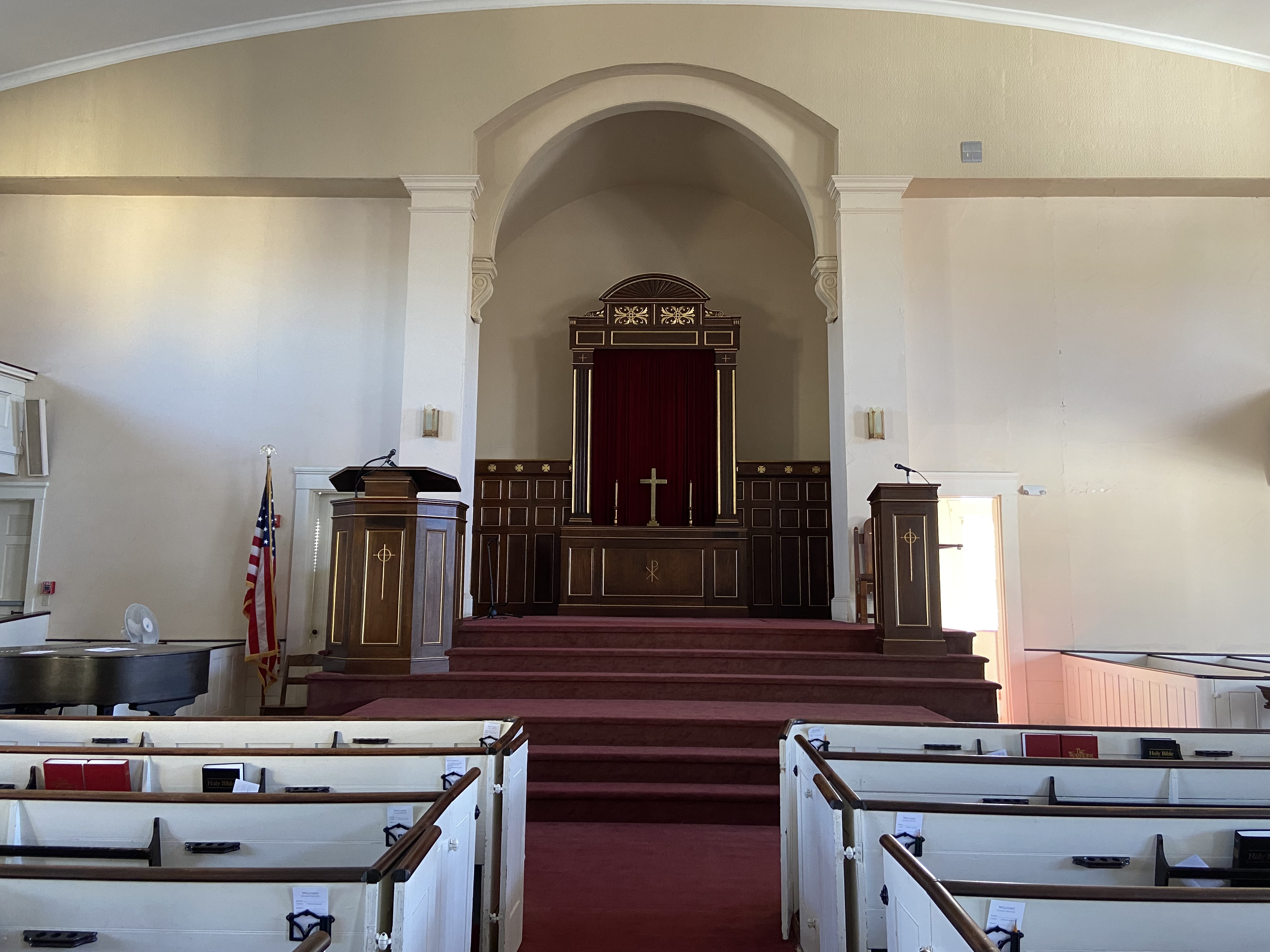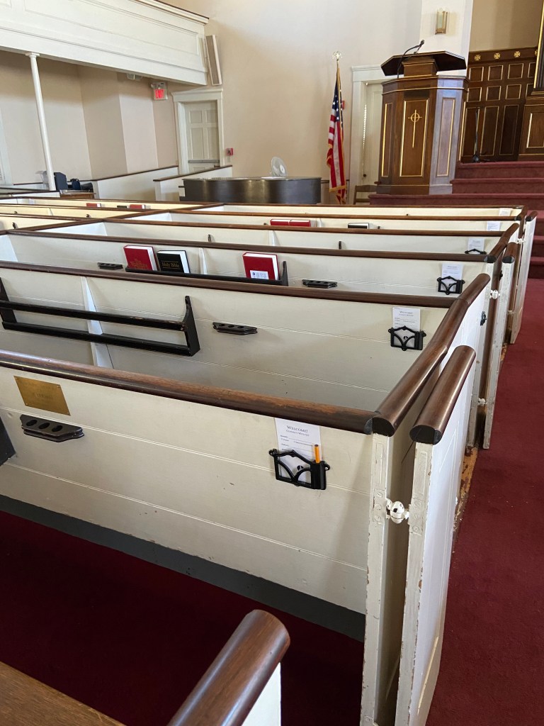 The current minister at United Baptist Church of Newport is Pastor David Dewberry – he has been with the church since 2018. I met with and had a wonderful conversation with Pastor Dewberry, who allowed me to go inside. The church took my breath away – just lovely, with a beautiful balcony surrounding the sanctuary and boxed in pews with the original doors remaining!