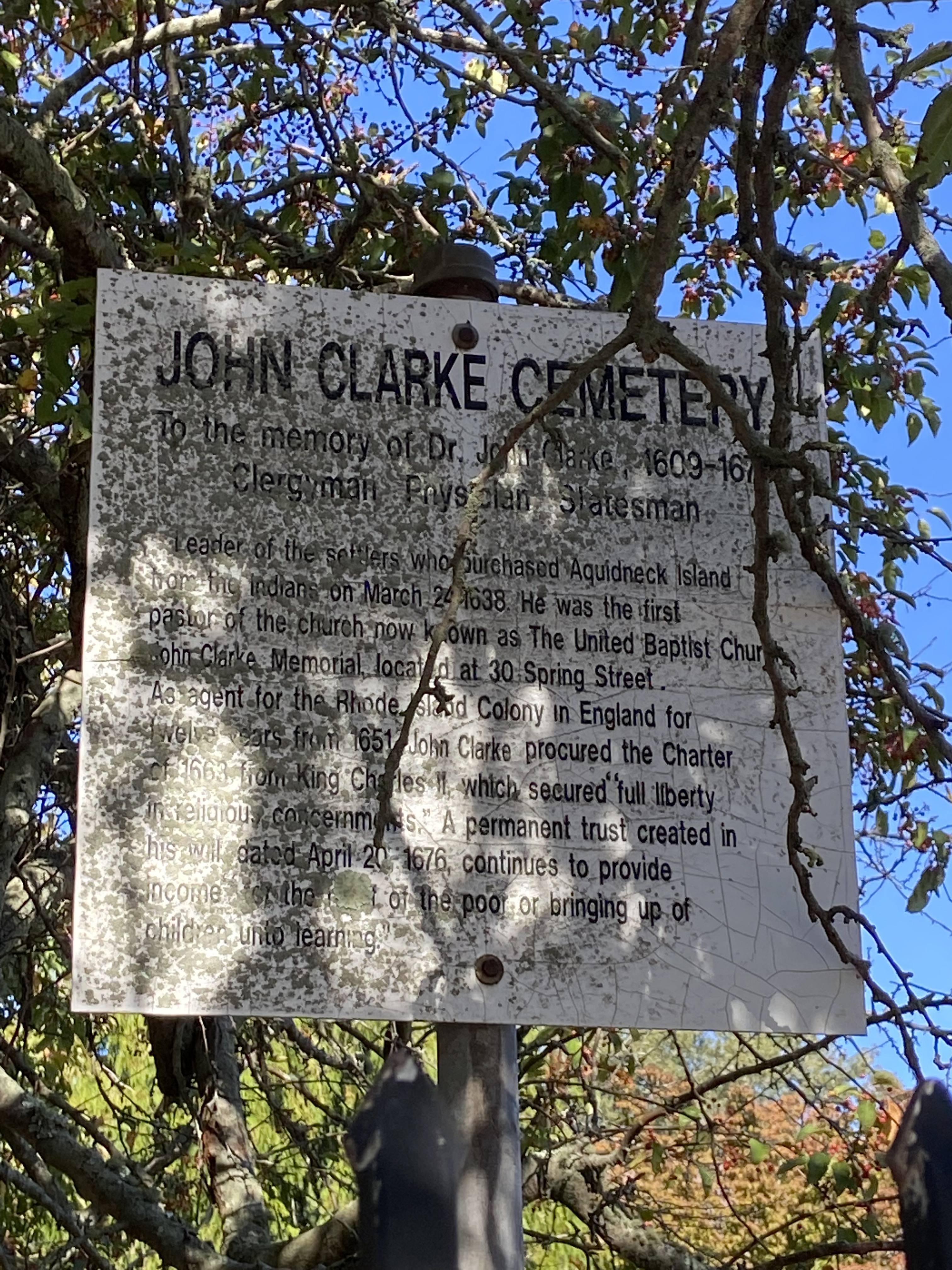 There was a large stone in front of the cemetery entrance with this plaque honoring John Clarke.