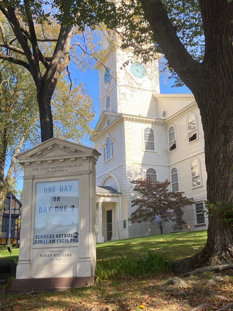 I recently spent a week in Rhode Island and visited a piece of American Baptist history. I had heard the stories about Roger Williams and John Clarke – pioneers in the American Baptist denomination and champions of religious freedom – in Providence and Newport, RI and was thrilled to discover their churches are still alive and being used for Baptist worship. So, I had to go see them. I am a member of the Albion First Baptist Church and found their stories fascinating. Following is information I gathered for an article for our church newsletter….plus a bit more and all the photos I took along the way.