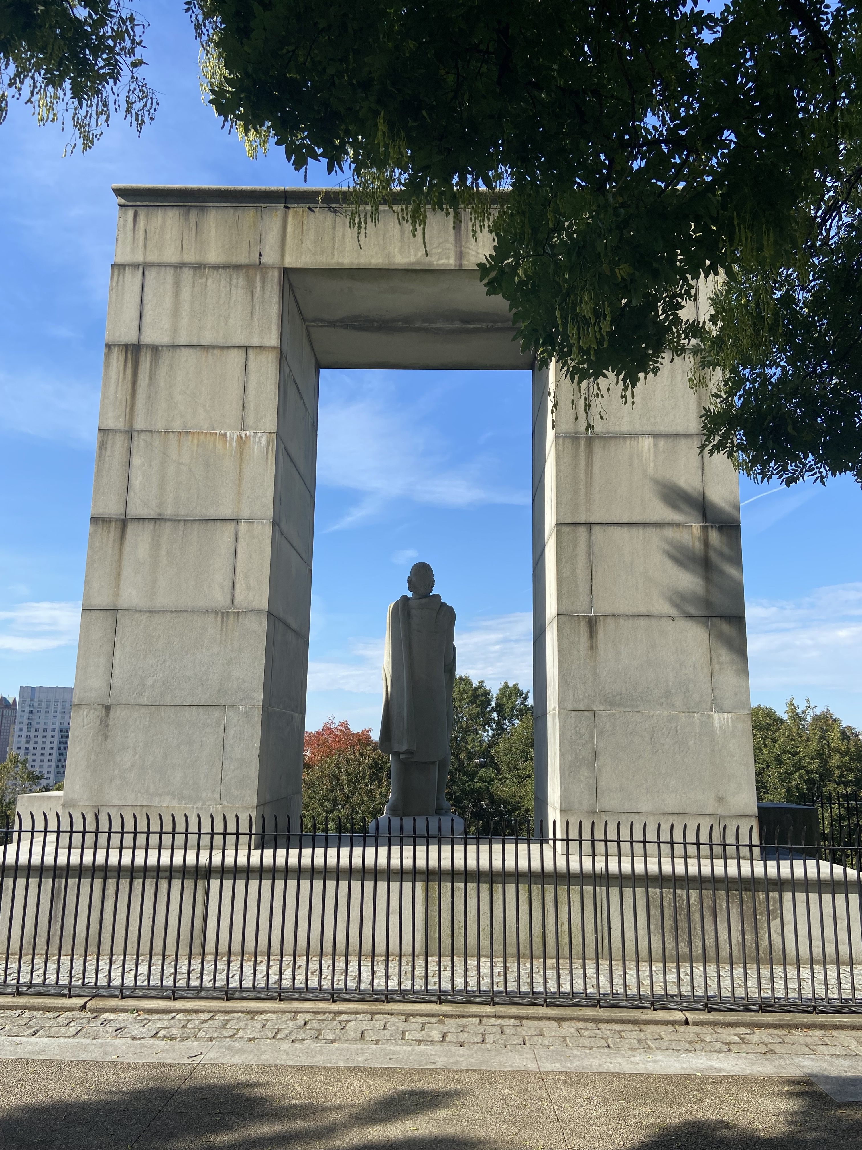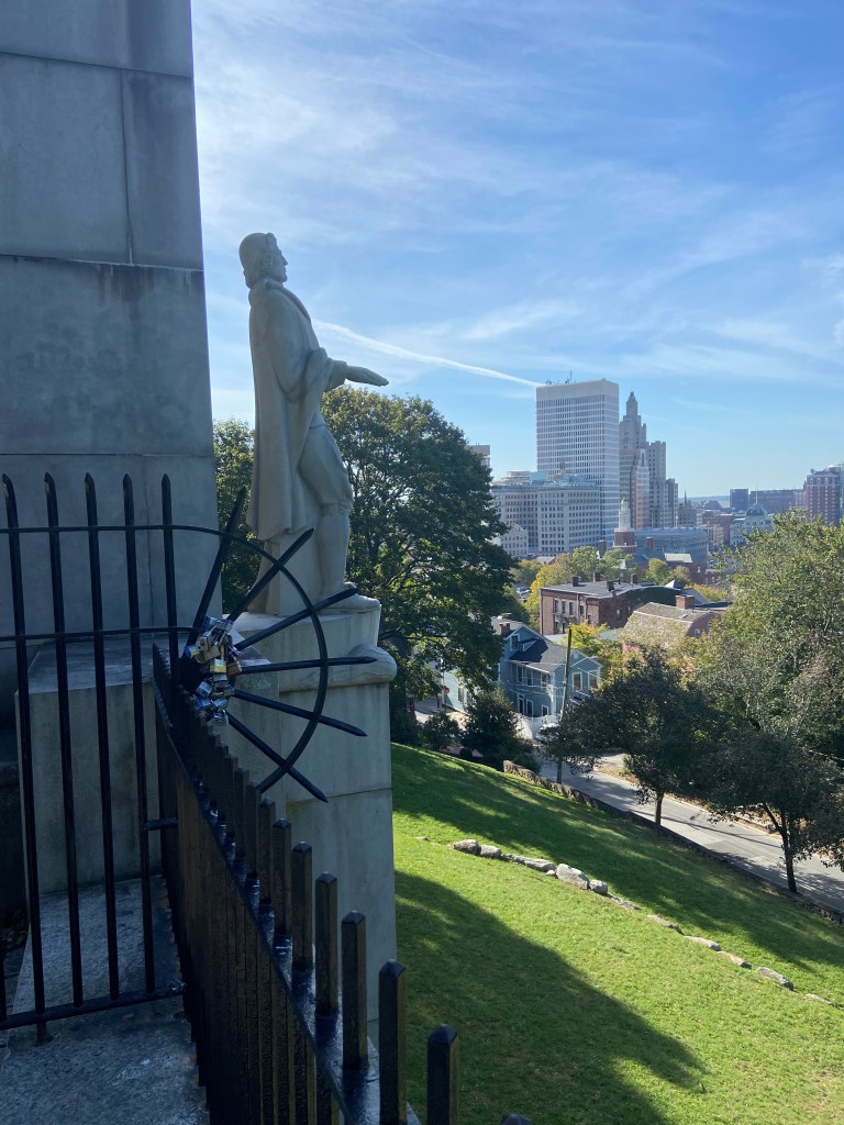 Roger Williams remains are interred in this monument. It was an interesting story about his remains. Apparently, he was originally buried at his home in an unmarked grave in 1683 – the importance of his work unrecognized….the first of three burials for Williams. In 1860, in an attempt to honor him, his remains were moved to a family crypt in the Old North Burial Ground. A committee was formed to create a memorial to Williams and they selected Prospect Terrace as a suitable final resting place. However, funds were meager, the Civil War intervened, and no action was taken. Then, to mark the 300th anniversary of the founding of Providence in 1936, a new committee raised funds and interred the remains under a statue of Williams, dedicated in 1939, at Prospect Terrace.