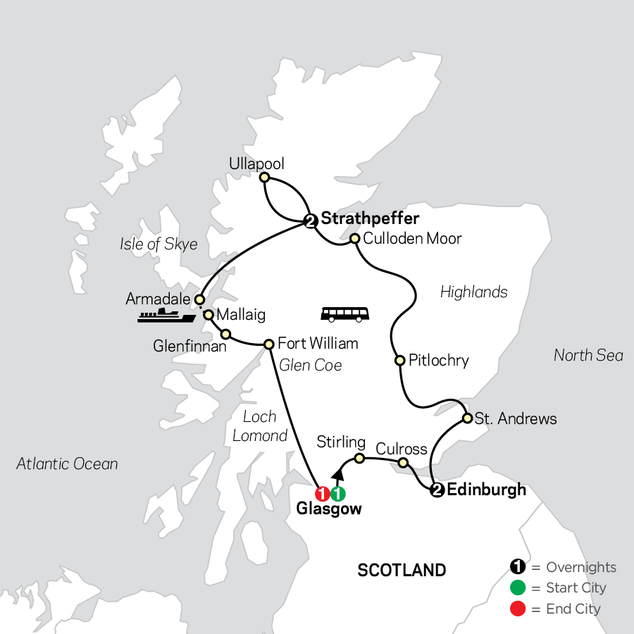 The tour called “Scottish Outland Adventure” and was hosted by the Cosmos tour company. This is is the itinerary map of all the places we visited in seven days – pretty much saw the entire country! We arrived in Glasgow on Sunday morning and spent our first night there. Then we spent two nights in Edinburgh, two nights in Strathpeffer, and our last night back in Glasgow. Here is the story of our trip.