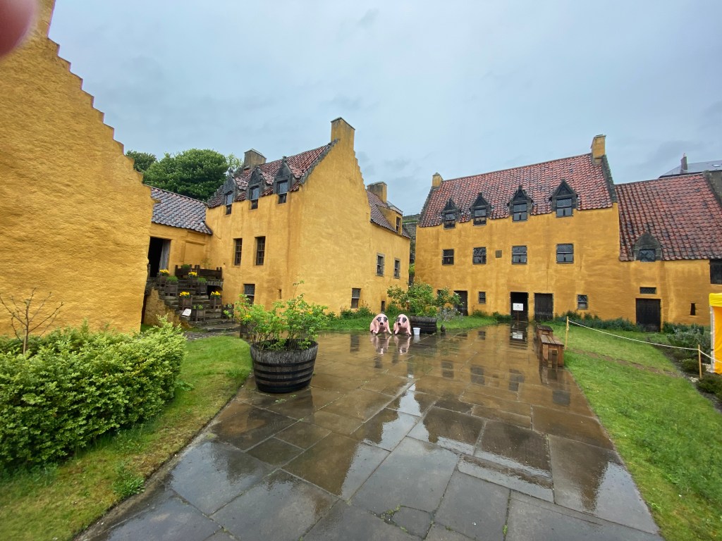 When we left Stirling Castle, we learned a new word: “Dreich” – a word plucked from the slang dictionaries of Scotland. It describes a dull, damp, Scottish day – one that’s devoid of light, warmth, and color…..in other words, a truly yucky day. We were supposed to spend I think and hour or so at our next stop – the village of Culross, but it is all outside stuff, so Mick called the office to get permission to make a couple unplanned stops and spend less time in Culross. We were all delighted by the additional stops – both were awesome and they gave us two experiences we wouldn’t have had otherwise.