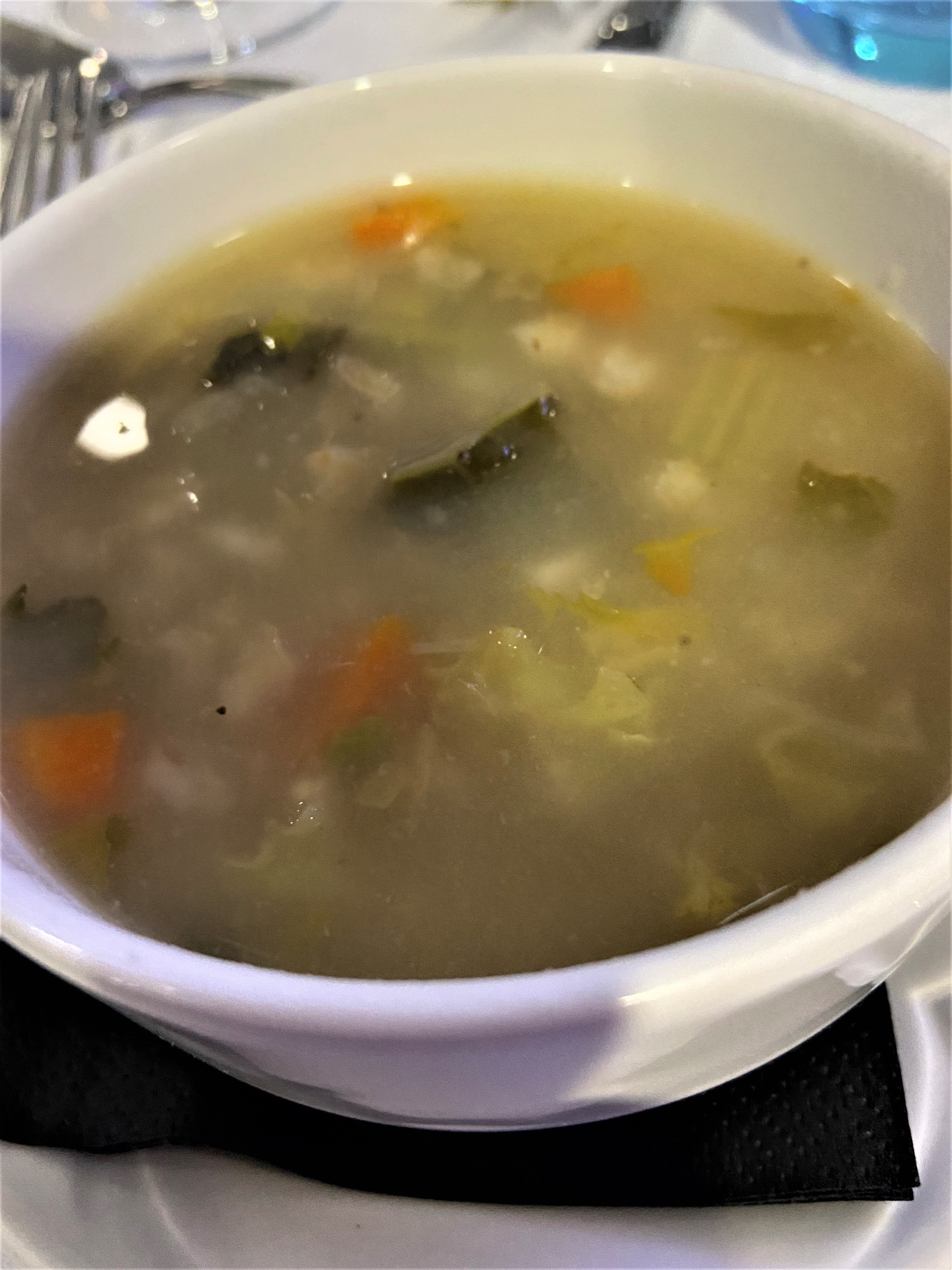 My dinner choice was the Traditional Scottish Broth – very good, but a bit bland, everyone got some Crispy Haggis Bon-Bons (again – scroll down to the “I TRIED IT!” post for more info on this), and my main course choice was Braised Beef, Fondant Potatoes (that square thing), and Roasted Root Vegetables – all VERY good! The dessert was cheesecake, so I passed on that, but we also had Scottish Shortbread with our tea and a glass of wine. A very nice meal, in deed!