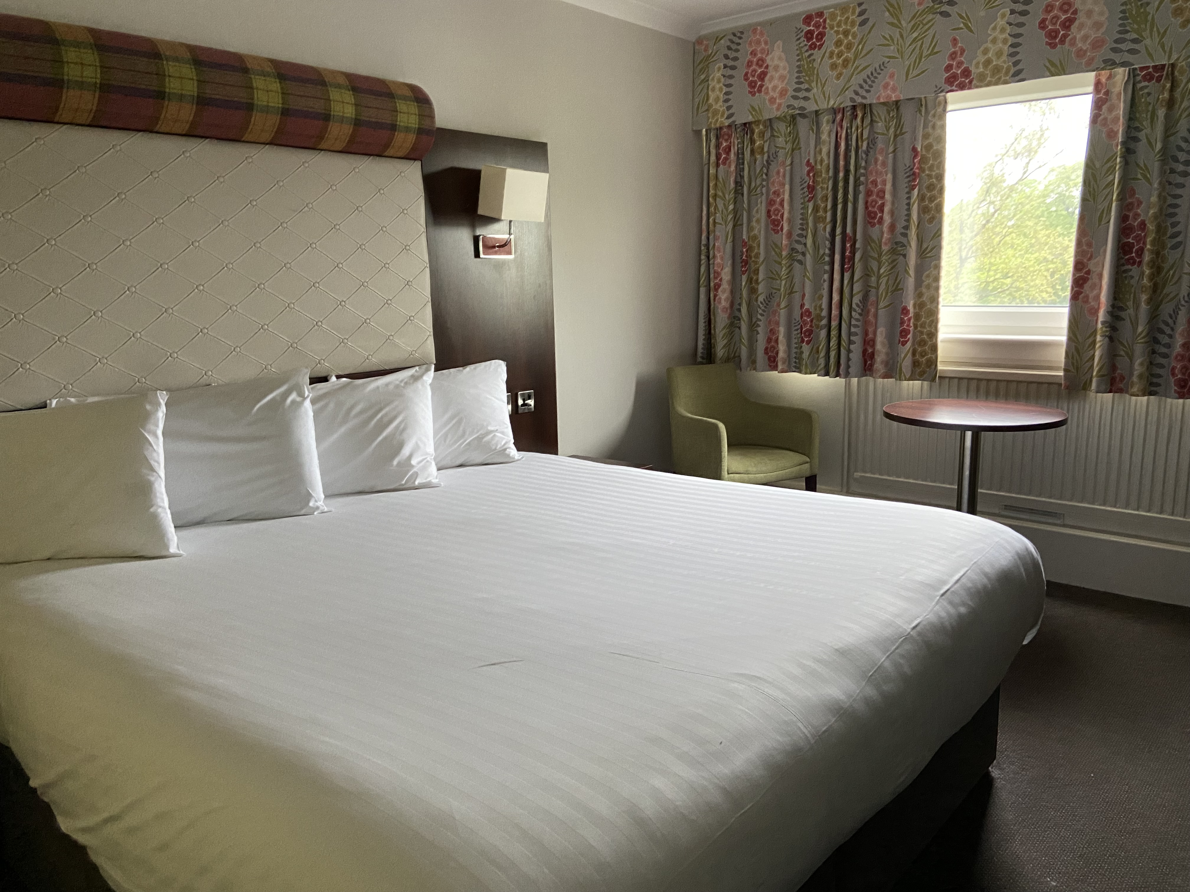 DAY ONE: We flew out of Buffalo on Saturday afternoon with layovers in Detroit and Amsterdam and landing in Glasgow Sunday morning. We were all pretty tired when we got to the hotel, but our rooms weren’t ready. Some of us just curled up in the lobby to read and relax and some took a tram to downtown and wandered around some. Our first hotel was The Leonardo Inn Glasgow West End – a nice, clean hotel that served an included buffet breakfast with traditional Scottish breakfast items. I slept like a log…..even though the bed was harder than I usually like and was a bit lumpy…..it didn’t stop me from falling asleep almost immediately and I slept soundly all night! This was my room: