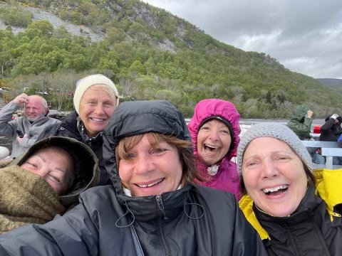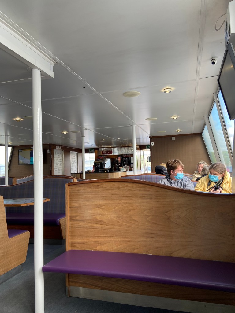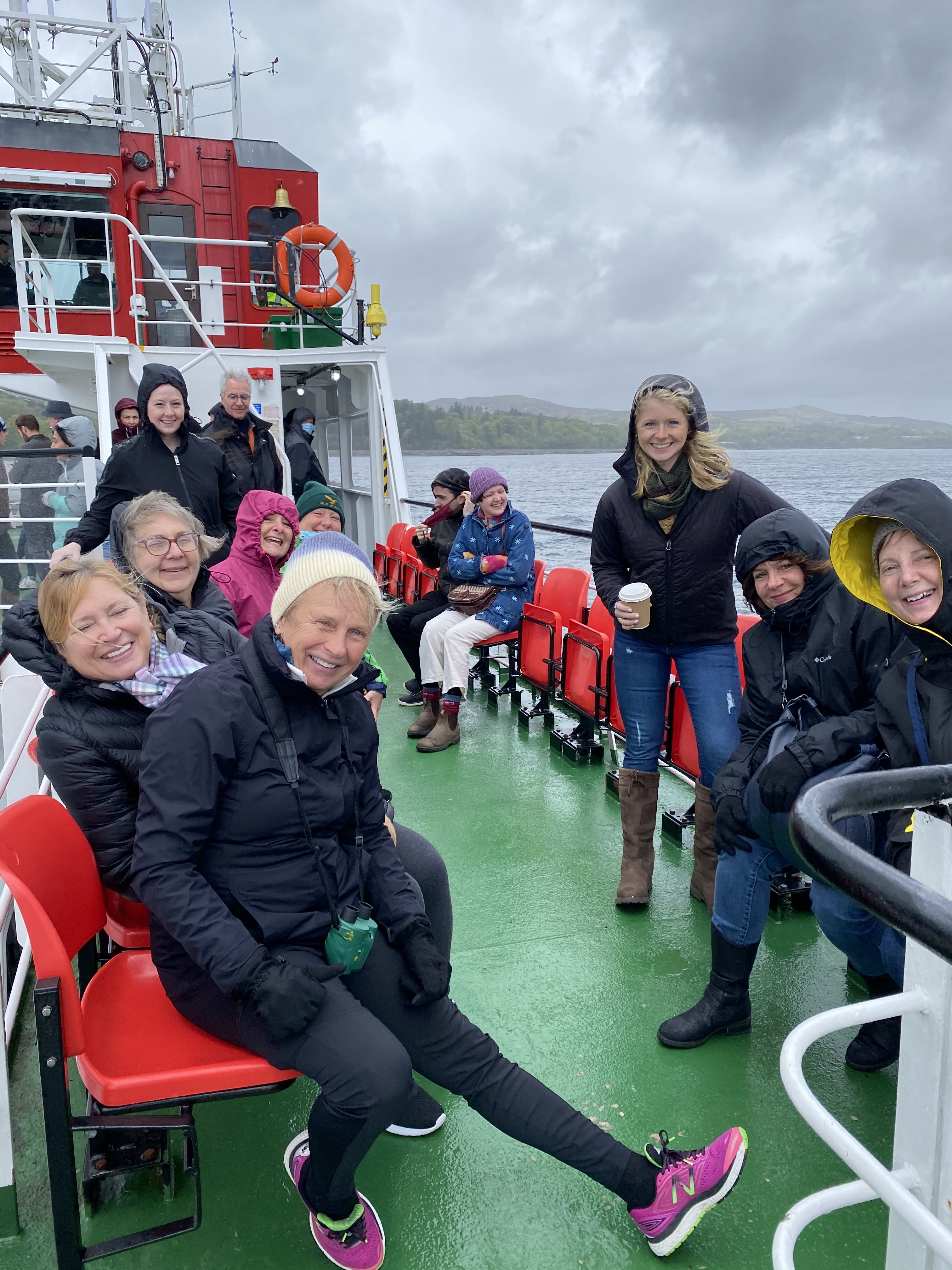 The route back to Glagow involved taking that huge coach onto a ferry across the Sound of Sleat to Mallaig – here are a couple photos of some of our group on the upper deck of the ferry — it was a cold, wet, windy day…..I stayed below……these photos are courtesy of a friend: