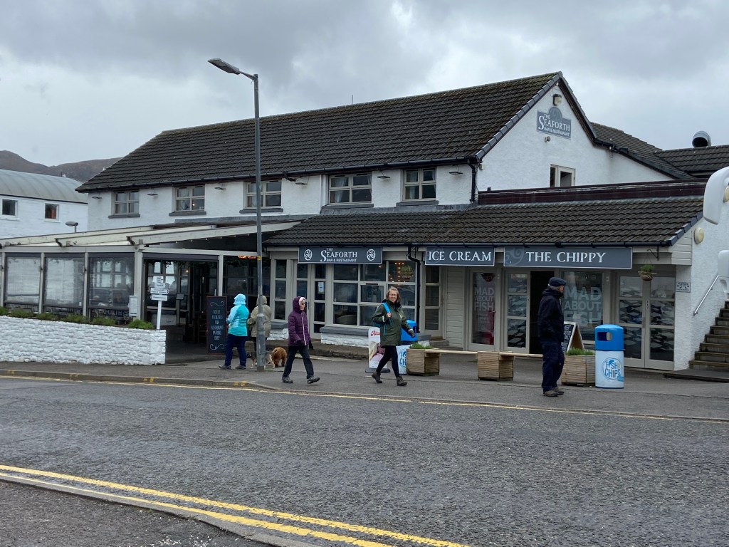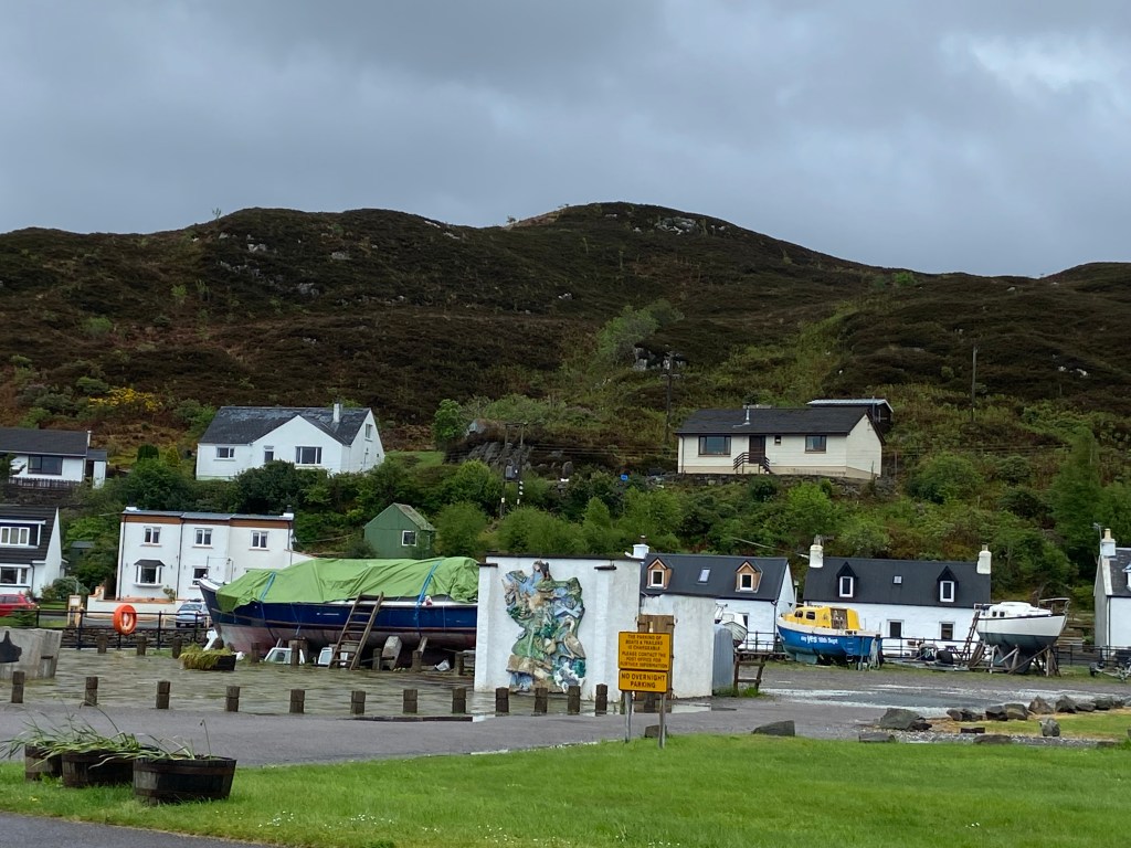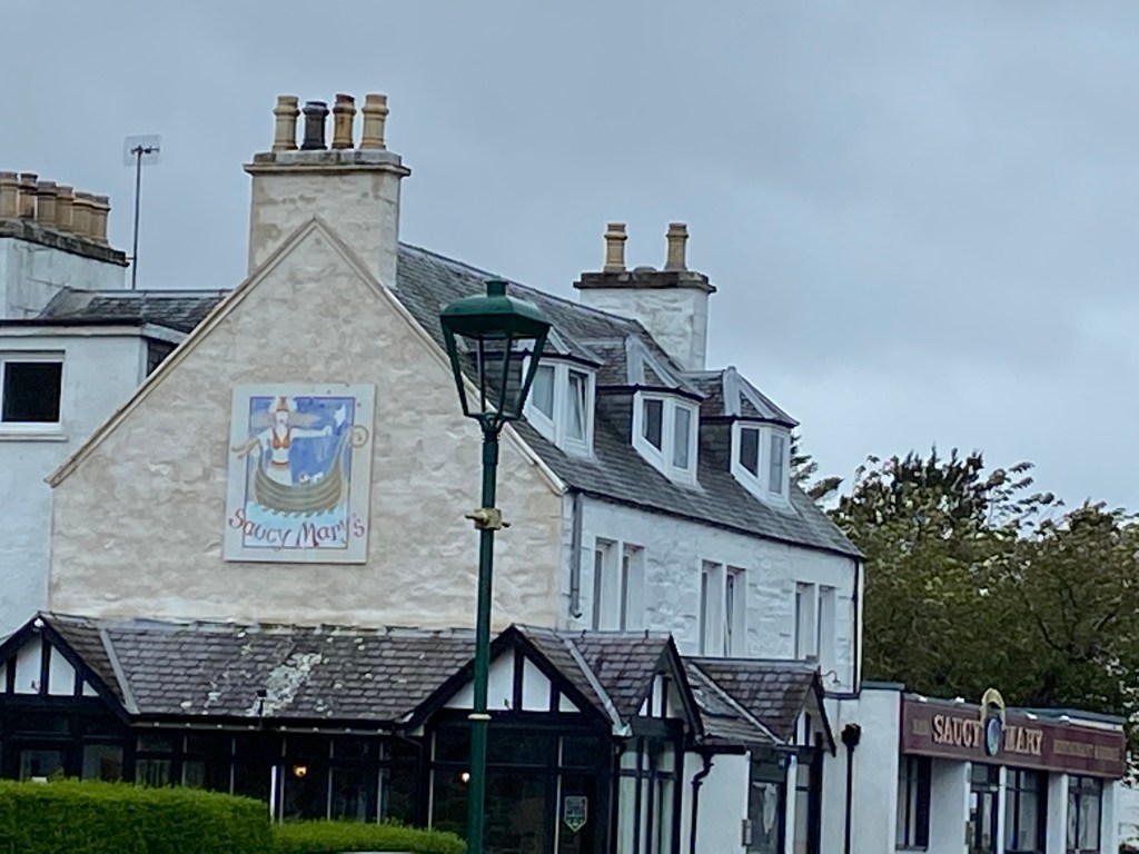 We stopped for lunch and shopping time in a quaint fishing village called Ullapool on Loch Broom. I had the most incredible lunch of fresh locally caught langoustine lobster and chips with garlic bread — OMG – heavenly!!! After lunch, I shopped a bit, took some photos, and had some creamy Scottish ice cream – flavor was a Scottish traditional soda flavor – Irn-Bru – delicious….orangey with an aftertaste of berry or root beer or something like that – hard to describe, but it was soooooo good and very different!!!!