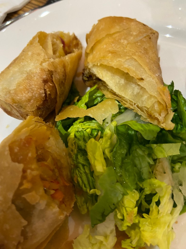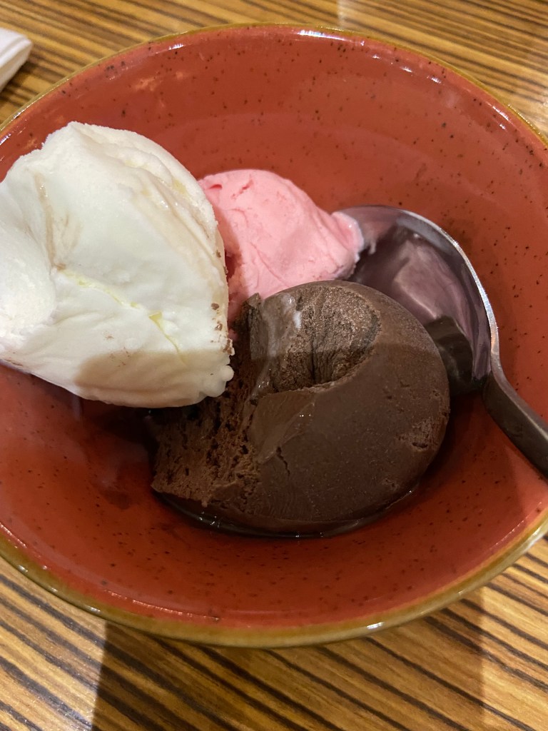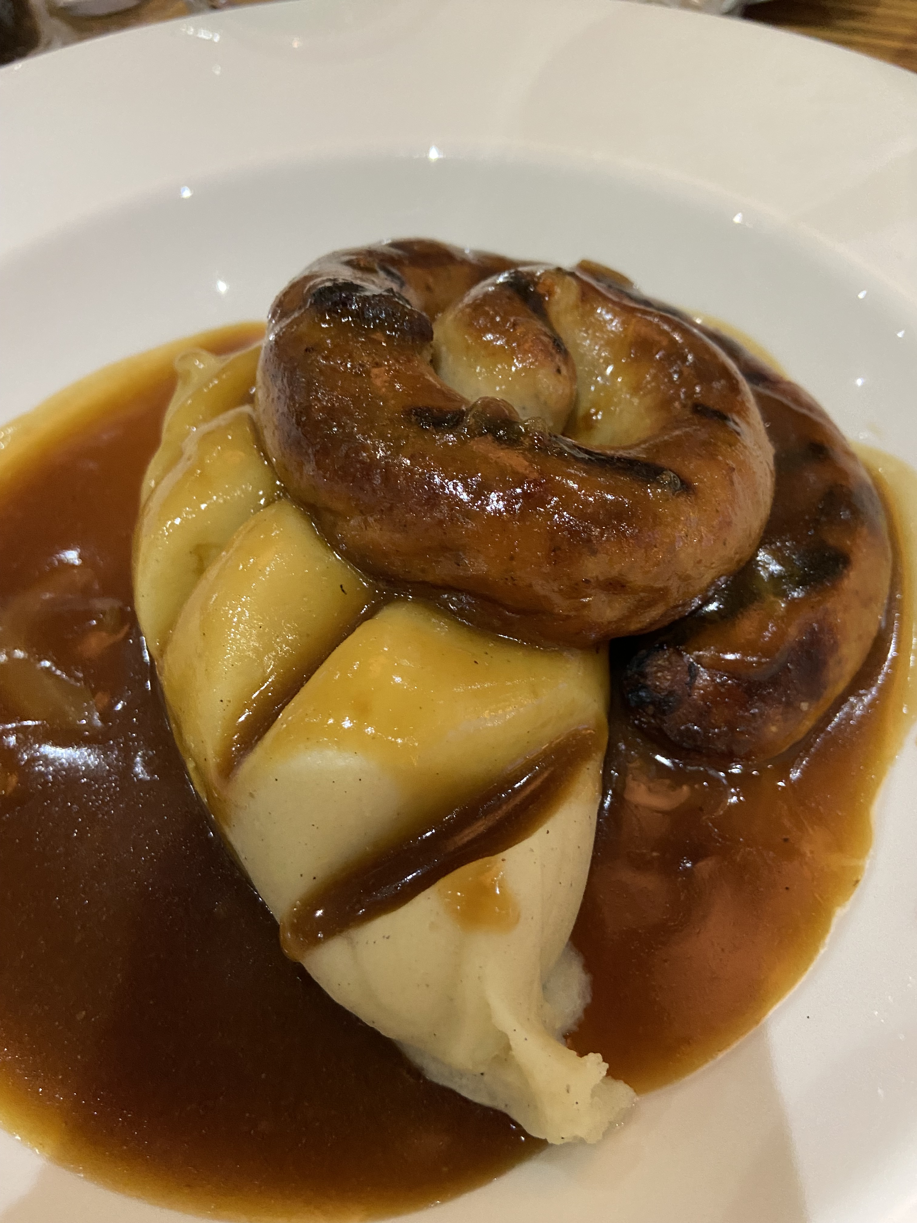 That night, we had our final dinner together – I chose the spring rolls, bangers (sausage) and mash, and ice cream……I was a little leery of the sausage and mashed potatoes because it was covered in gravy — I thought, gravy on sausage???? But, I decided to try it…..one more traditional Scottish / British meal…..and I am so glad I did – it was delicious!!!