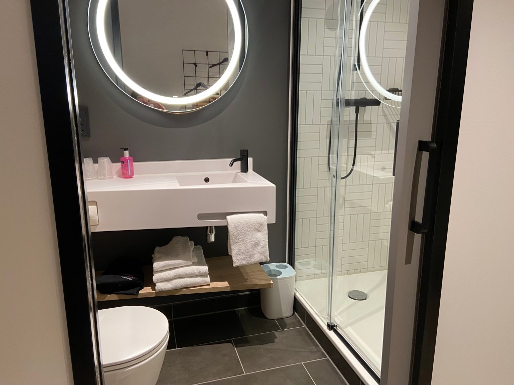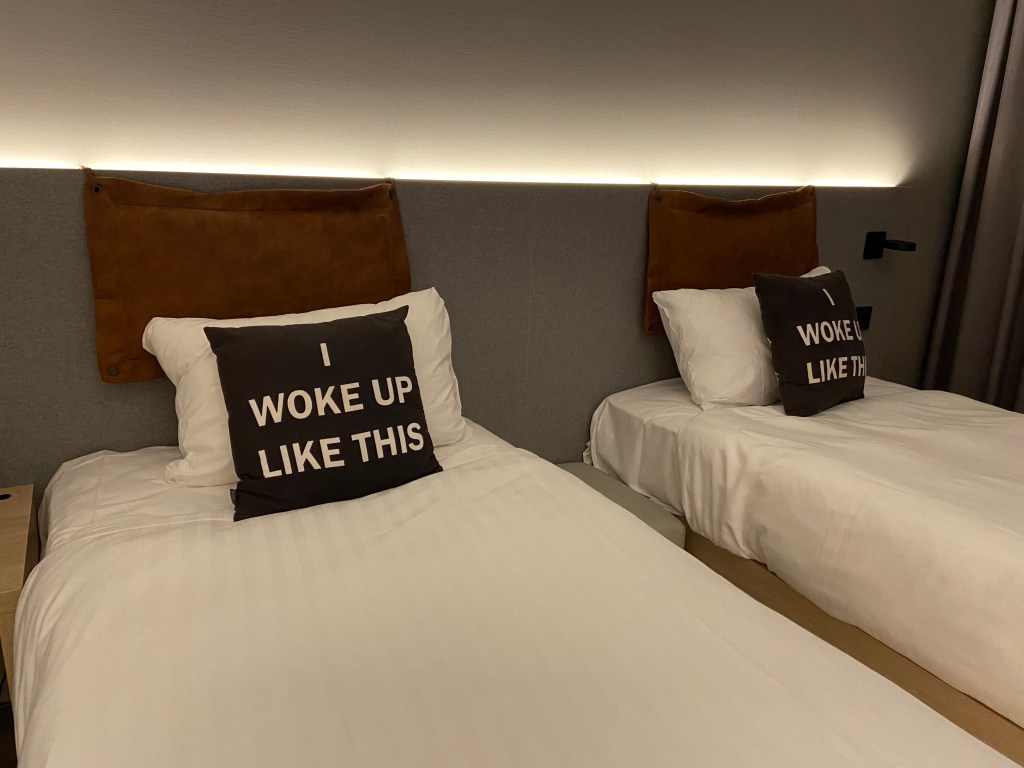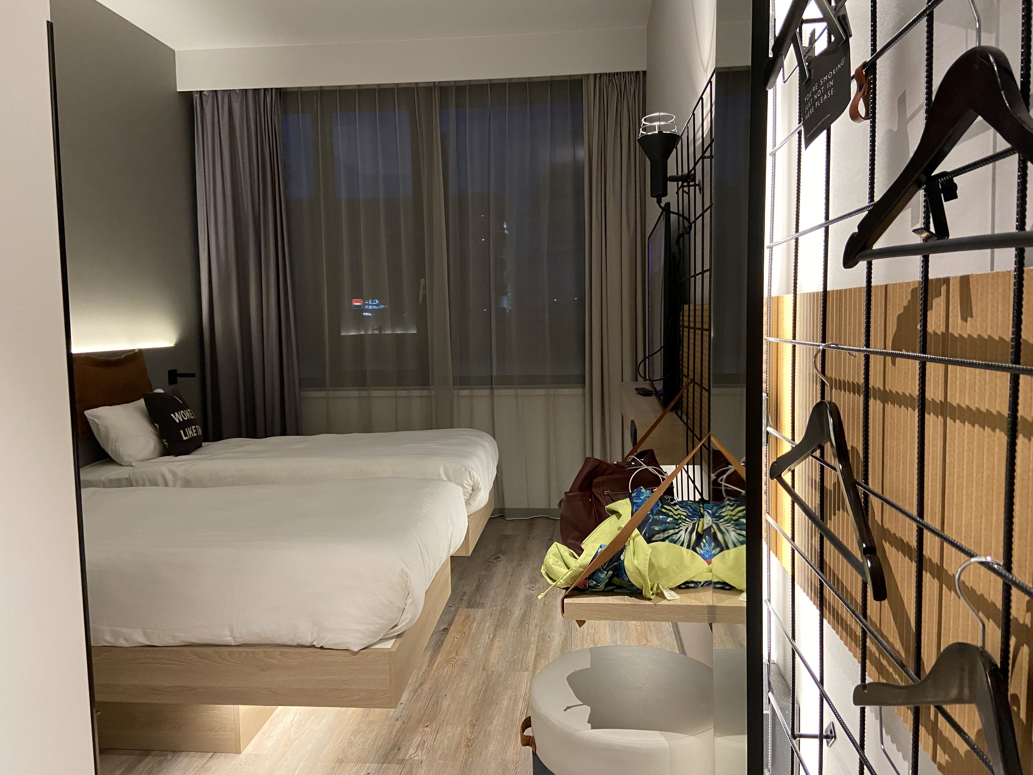 Dinner at an Asian restaurant in the airport while waiting for our new bookings (above) and my room at the Moxy (below)