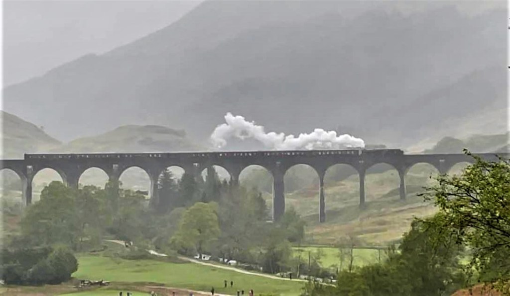 We stopped for a photo op at Glenfinnan to see the monument to fallen Jacobite clansmen and the famous viaduct well known to “Harry Potter” fans……I got a photo of the train seen in the “Harry Potter” films before we got to the viaduct and a friend got this great photo of the train going over the viaduct…..any “Harry Potter” fans out there find this to be a familiar sight?
