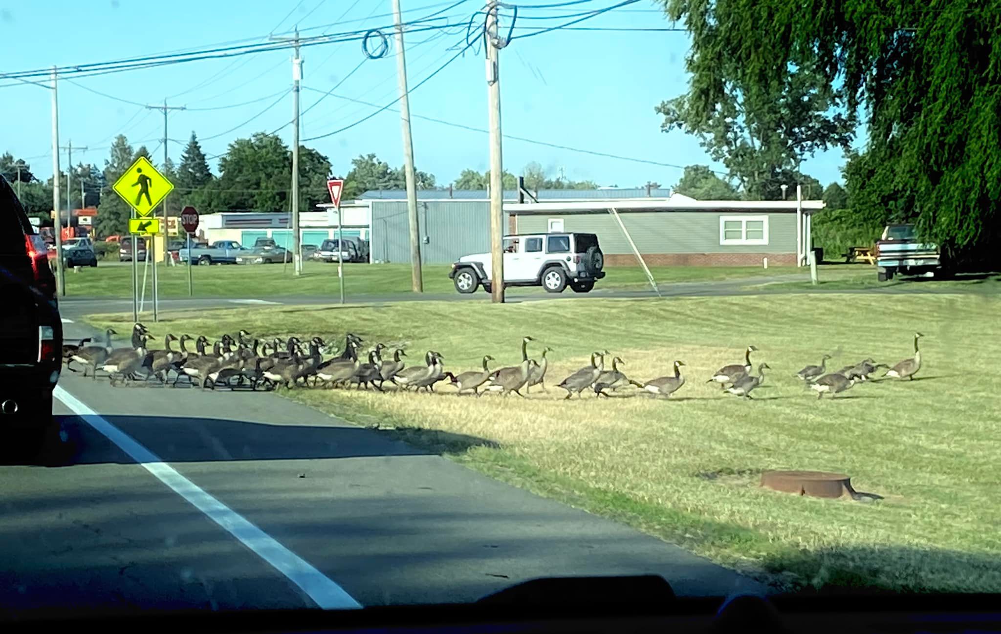 Traffic on busy Rt 31 at a standstill in both directions at rush hour so the Walmart geese can cross the road!